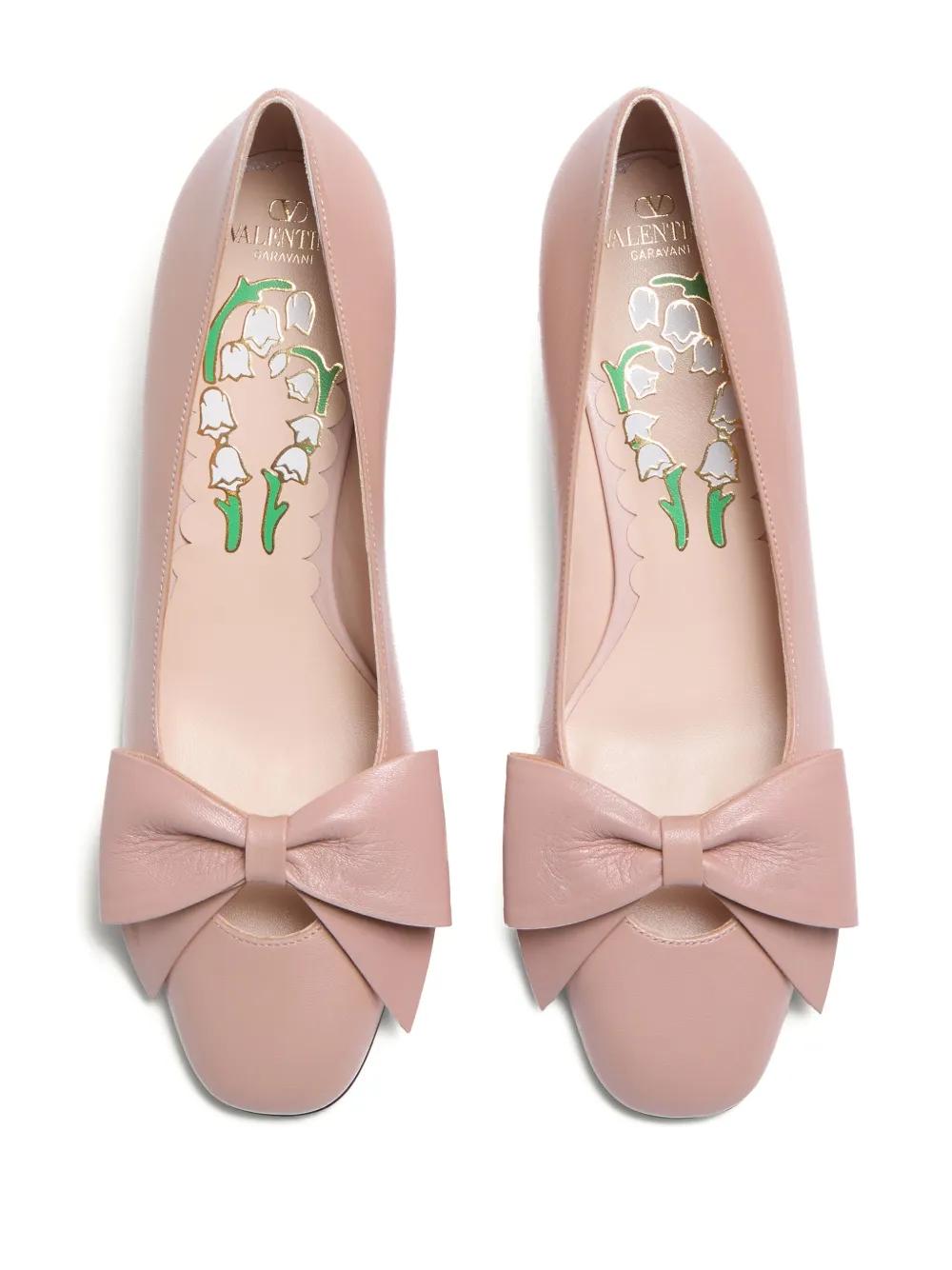 pink calf leather low heel signature VLogo plaque oversize bow detail round toe branded insole