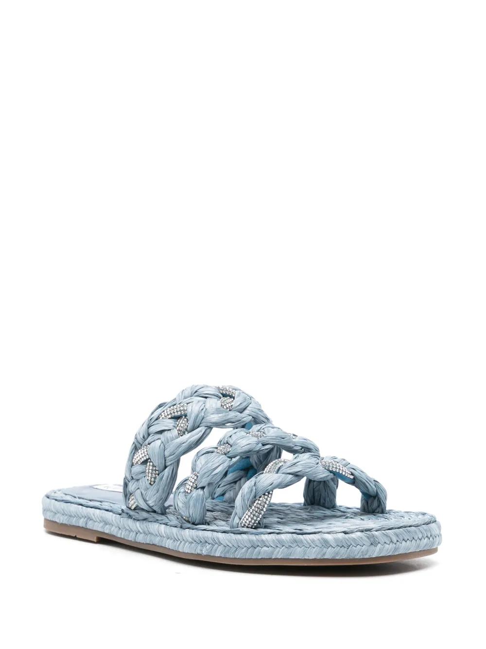 blue interwoven design square open toe braided straps with rhinestone embellishment branded insole flat rubber sole slip-on style