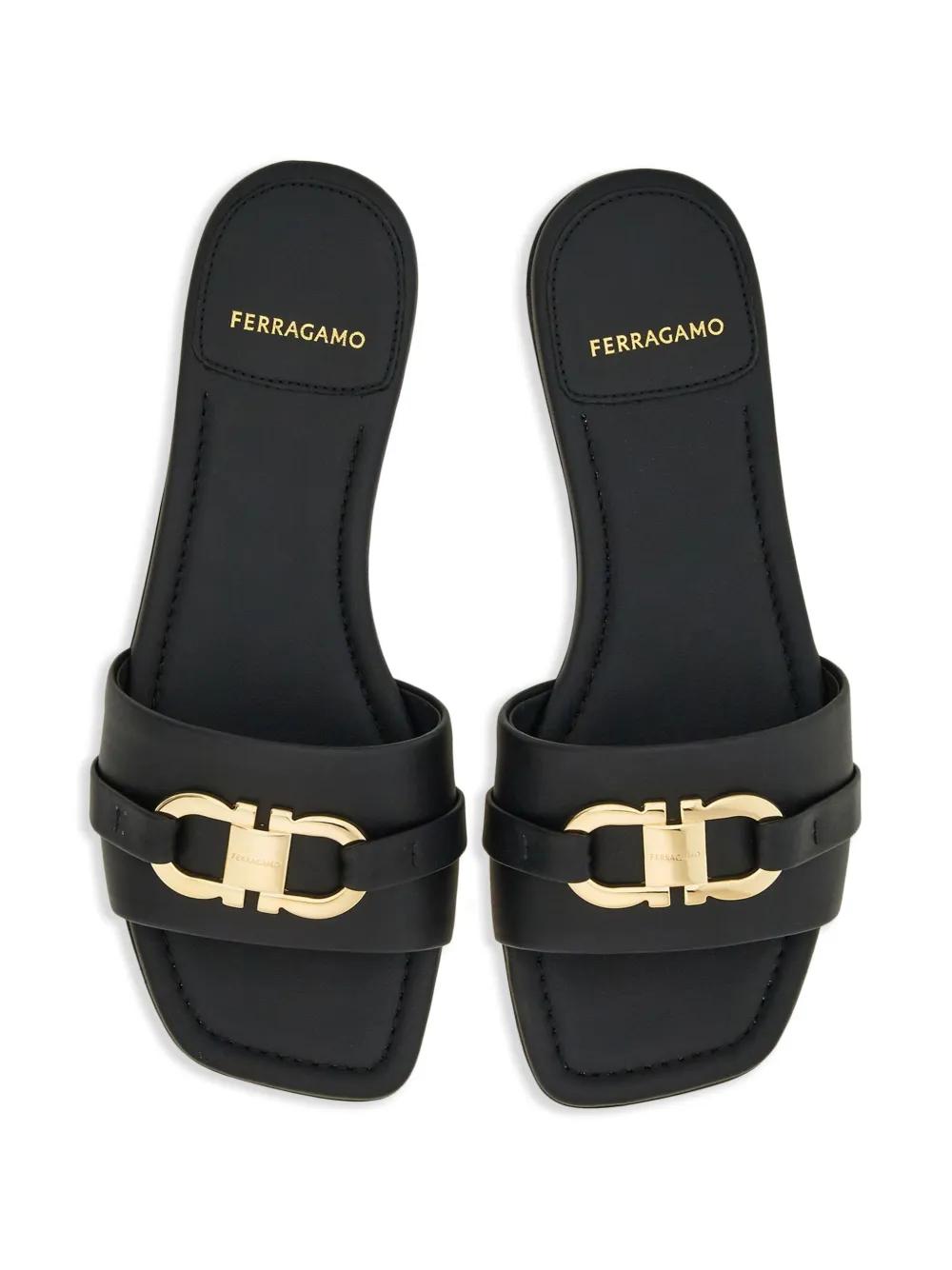 black lambskin Gancini plaque square open toe branded footbed flat sole