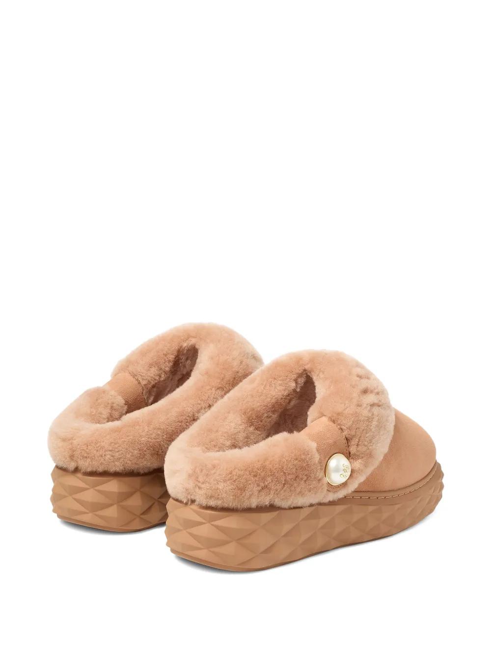 toffee brown fur trim button detail rubber sole geometric pattern platform sole