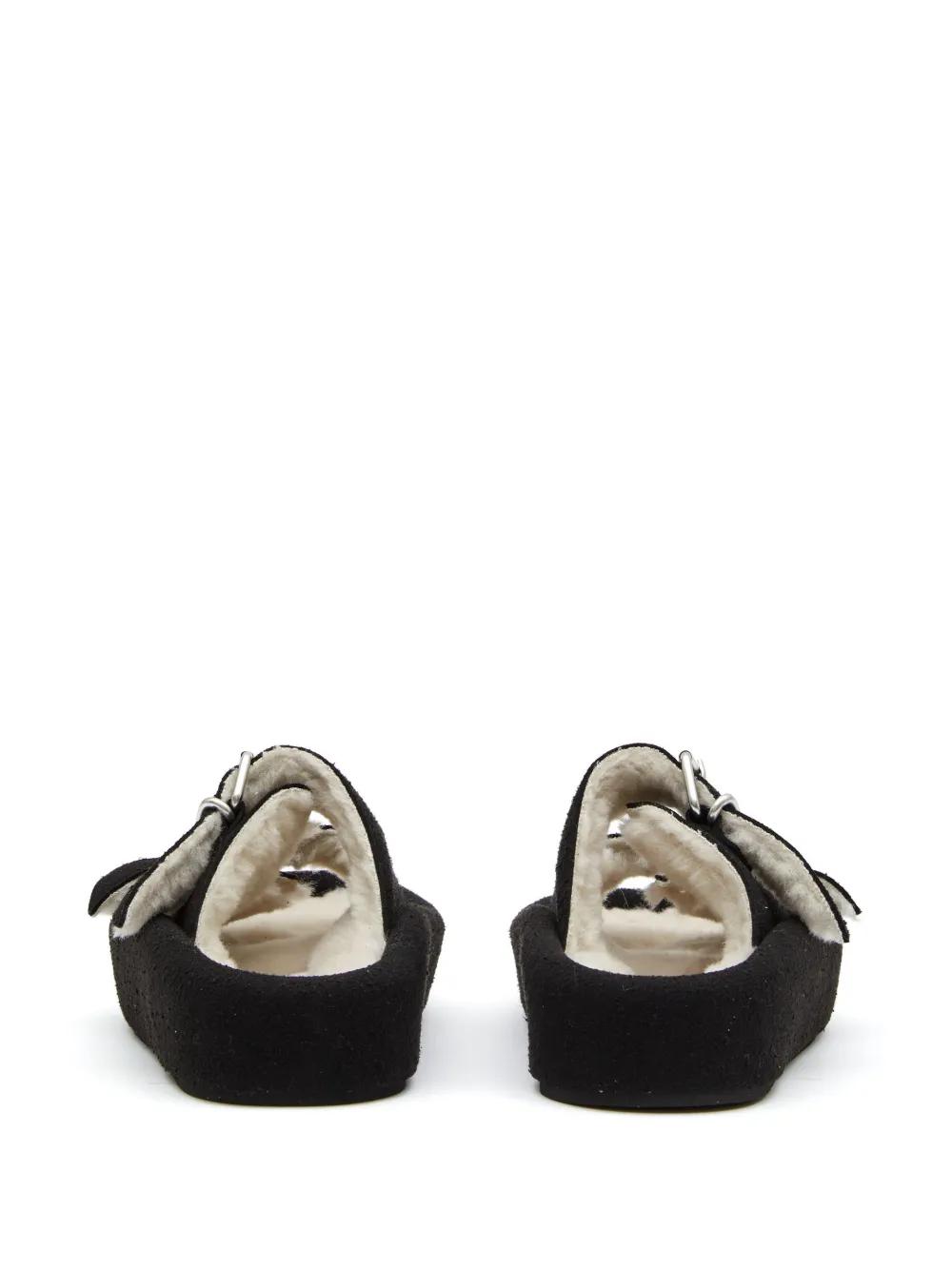 black/ivory white open toe slip-on style faux-fur detailing double buckle fastening