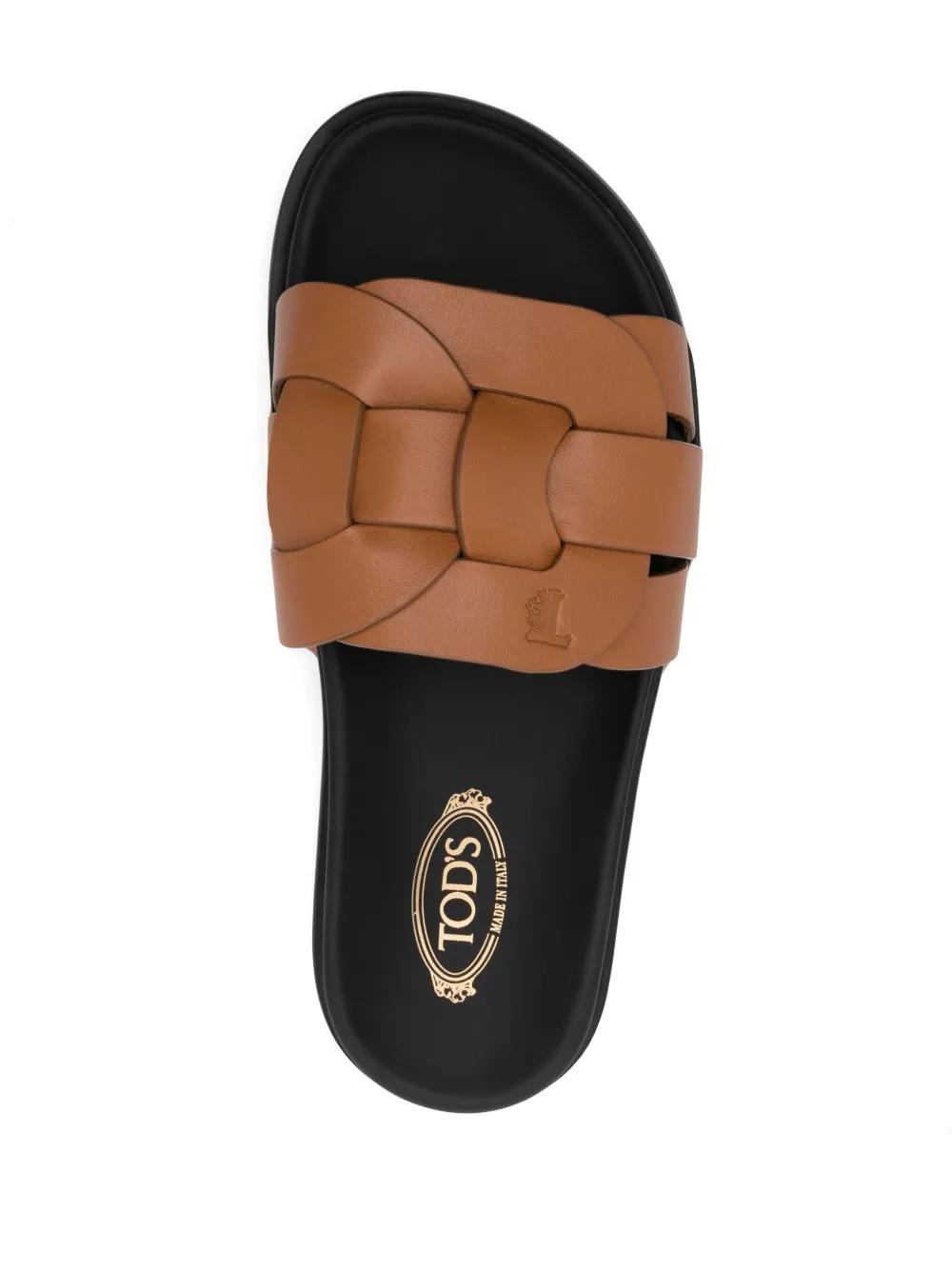 light brown calf leather interwoven design branded leather insole open toe slip-on style flat rubber sole