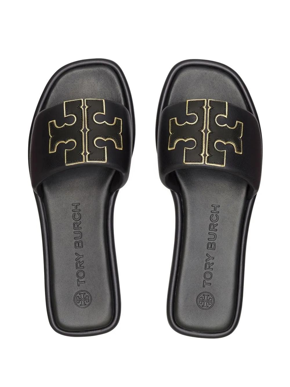 black calf leather logo patches to the front open toe slip-on style flat rubber sole
