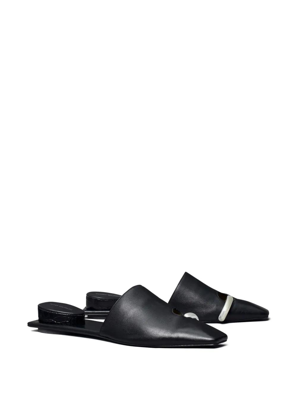 black nappa leather grained texture square toe D-ring findings branded footbed leather lining low stacked heel leather outsole gold-tone hardware slip-on style