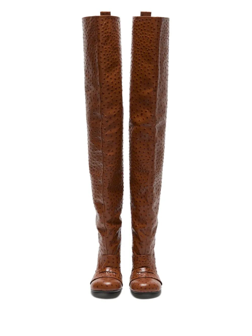 brown calf leather ostrich print stiletto heel thigh high round toe