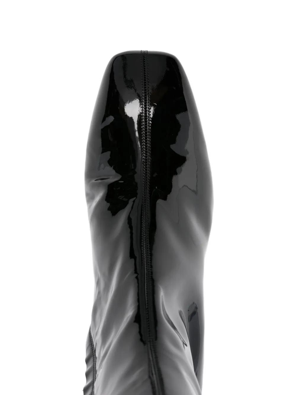 black patent leather square toe block heel back zip fastening calf-length shaft