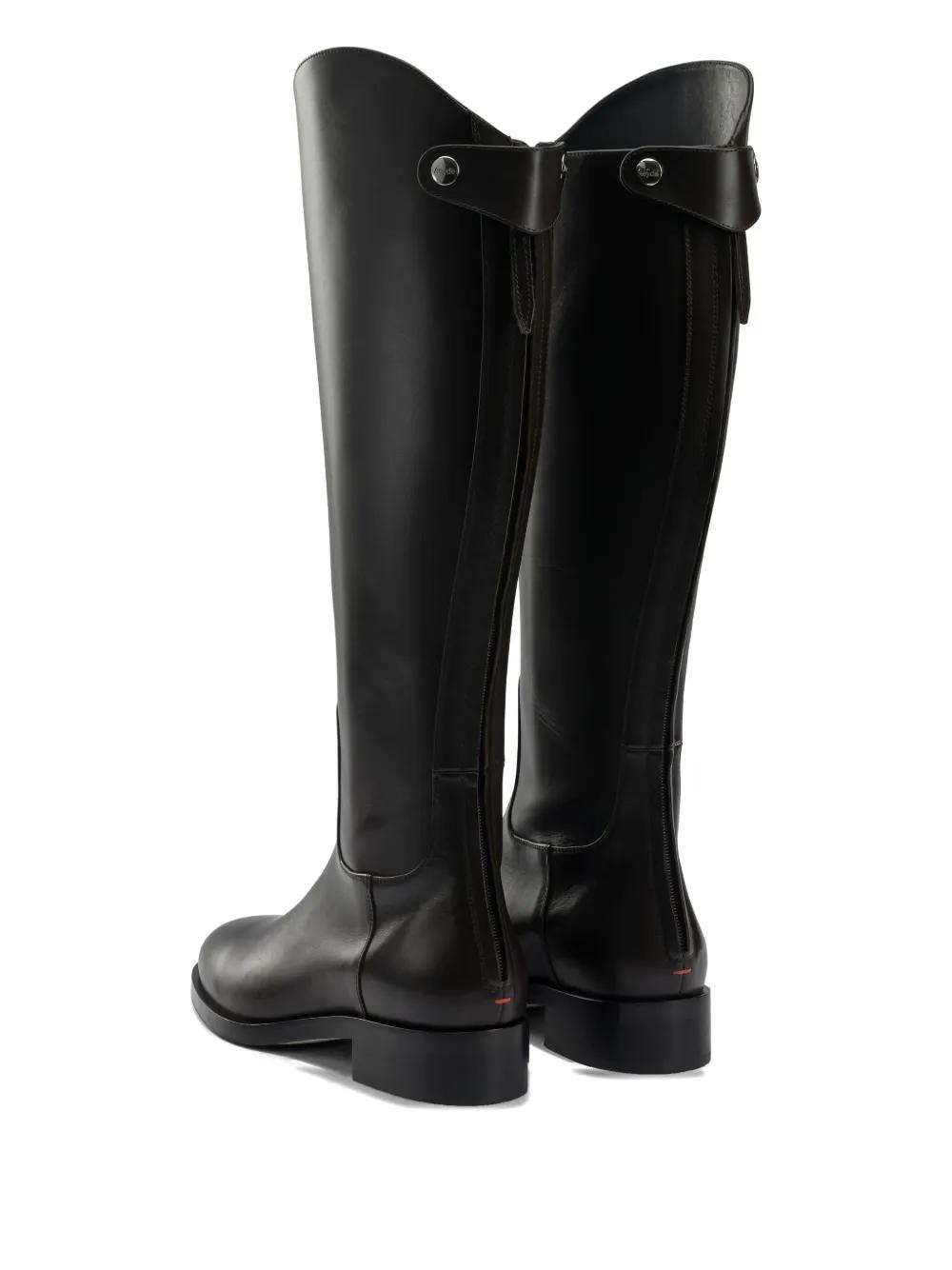 black calf leather upper block heel knee-high shaft round toe pull-on style