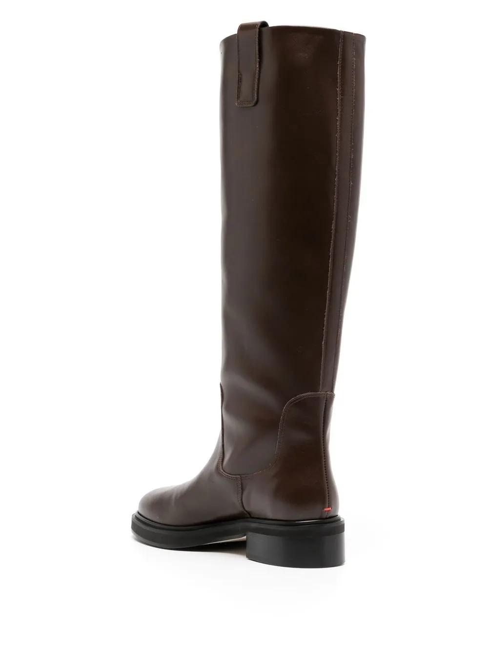 chocolate brown leather round toe double pull-tab at the opening 45mm chunky heel rubber sole slip-on style