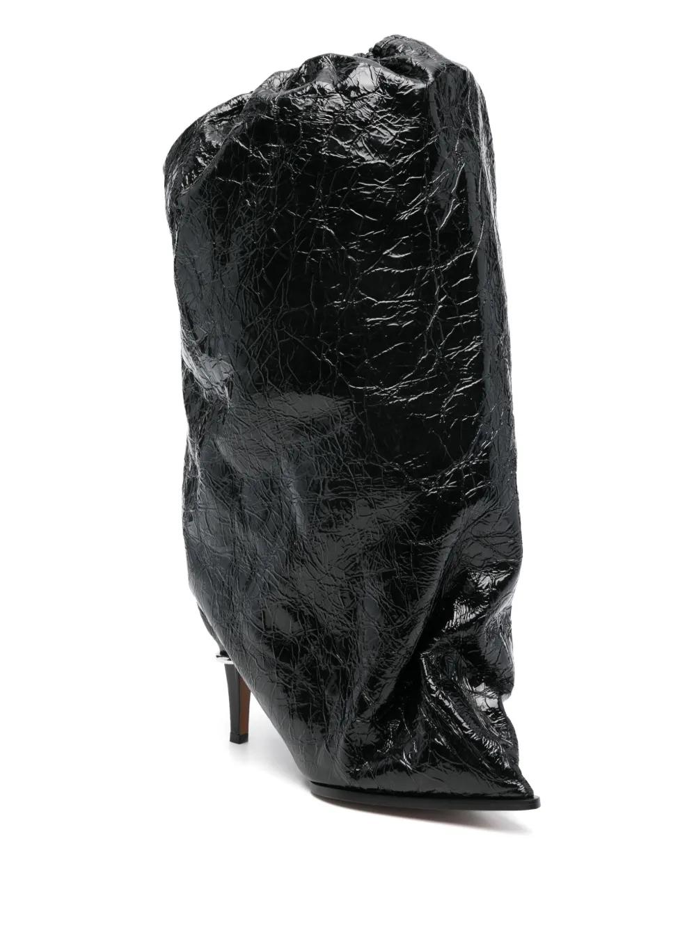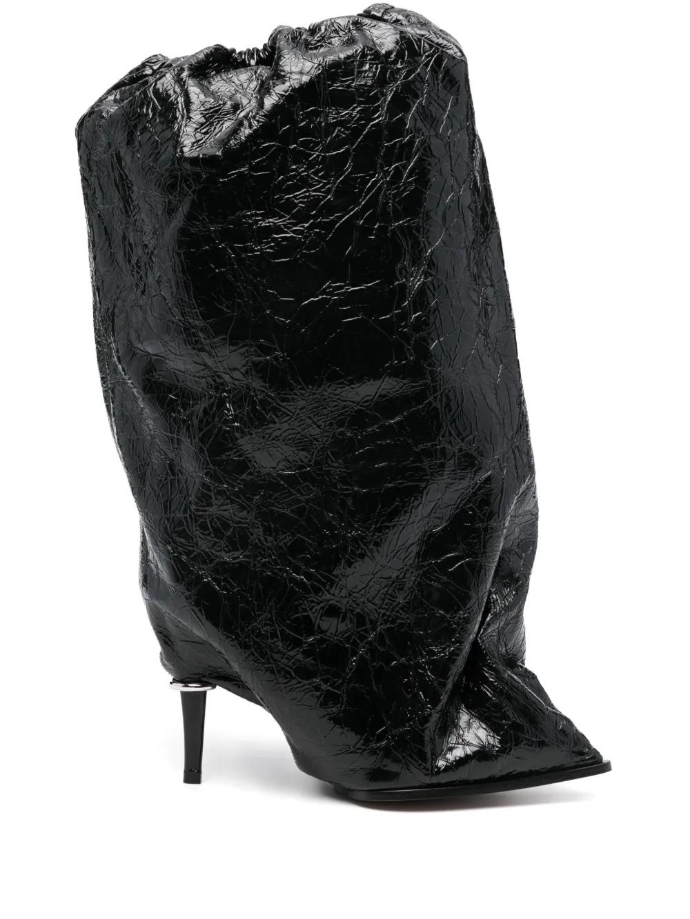 black calf leather patent finish crinkled finish side zip fastening ring hardware detailing stiletto heel layered details pointed toe branded leather insole rubber sole