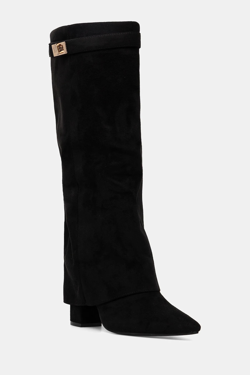 - Spiczasty, usztywniony nosek. - Usztywniony zapiętek zapewnia doskonałe wsparcie kostki i pięty. - Model na obcasie typu słupek. - Wygodne, boczne zapięcie na suwak ułatwia wkładanie i ściąganie. - Obwód cholewki: 41 cm. - Wysokość cholewki: 32 cm. - Wysokość obcasa: 9 cm. - Długość wkładki wynosi: 23 cm. - Wymiary podane dla rozmiaru: 37.