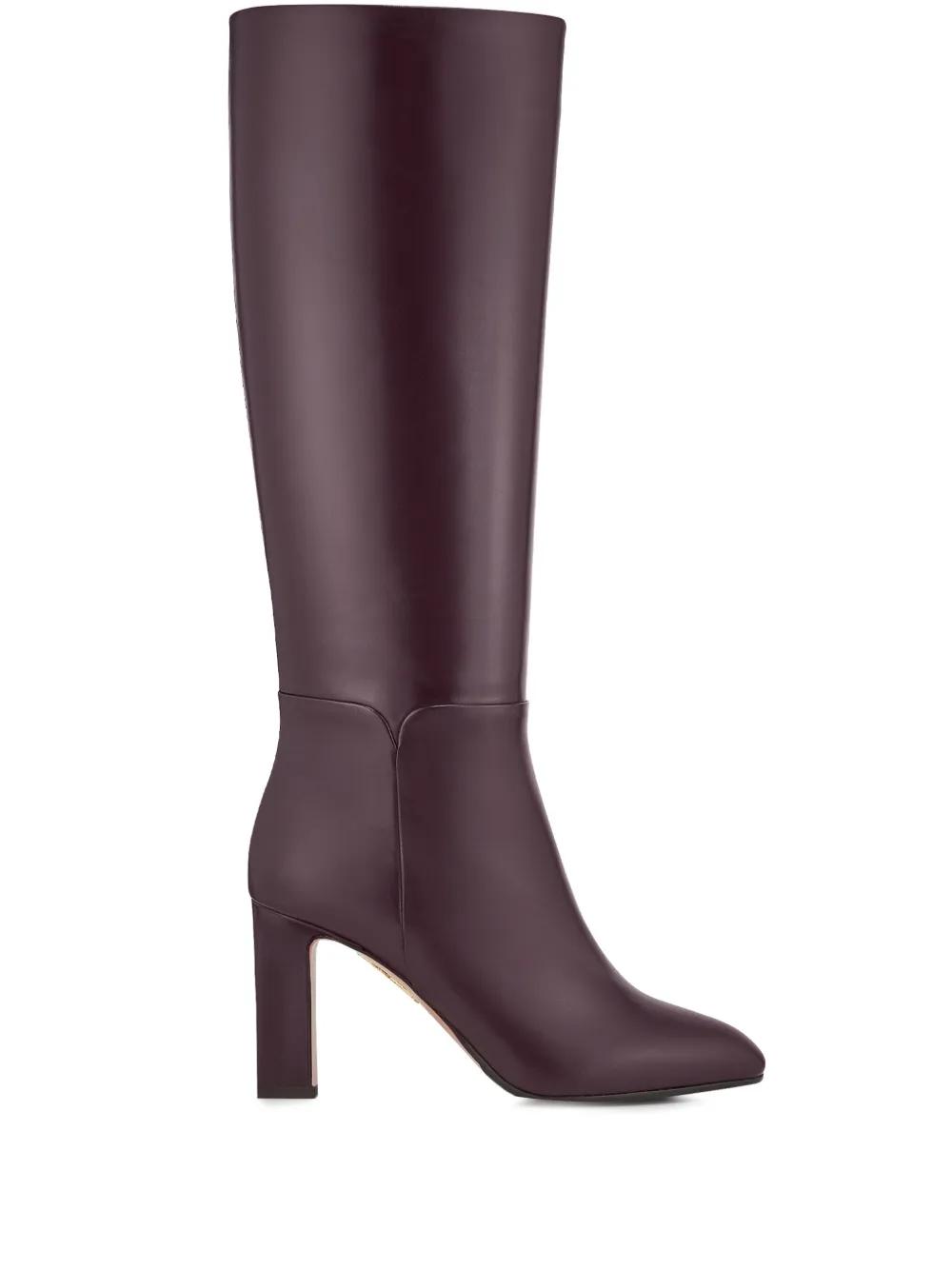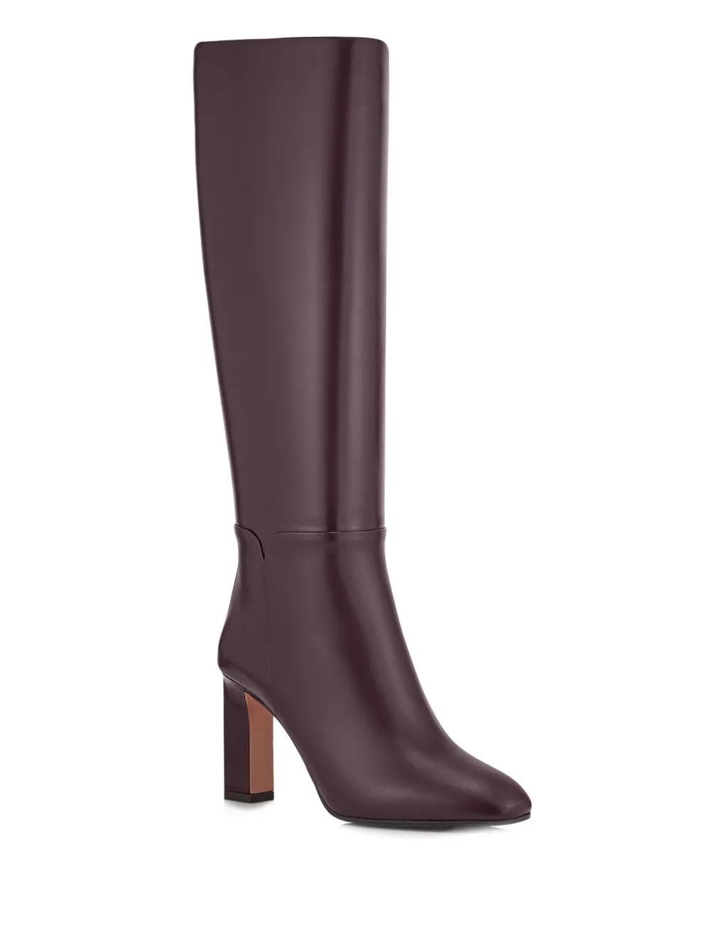 aubergine calf leather smooth grain panelled design gold-tone logo plaque signature pineapple motif round toe mid-calf length branded leather insole high block heel leather sole