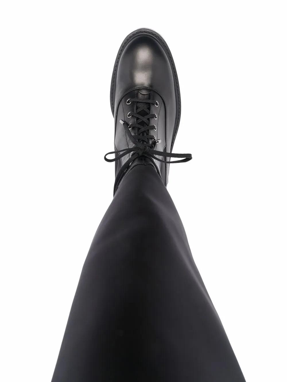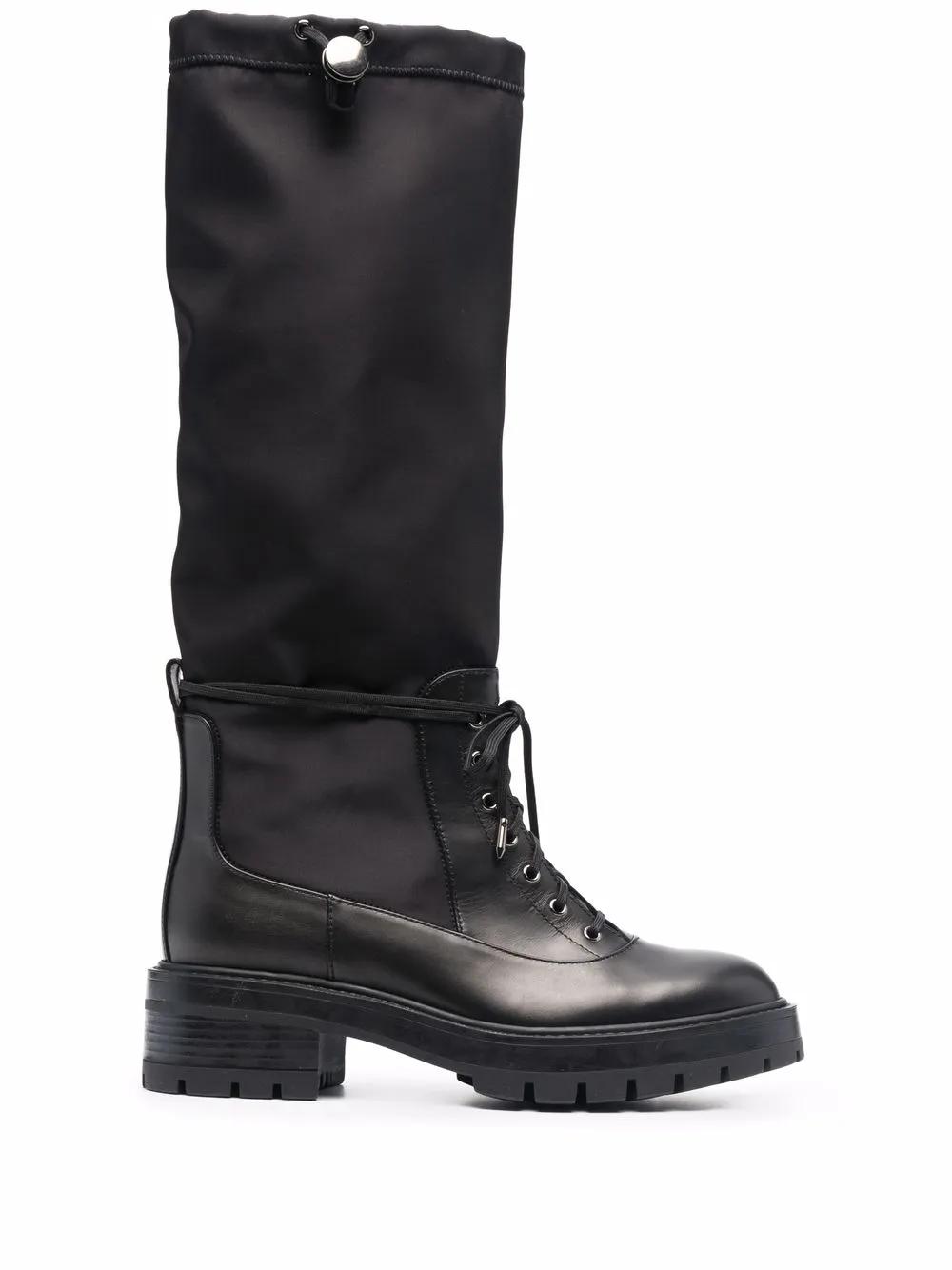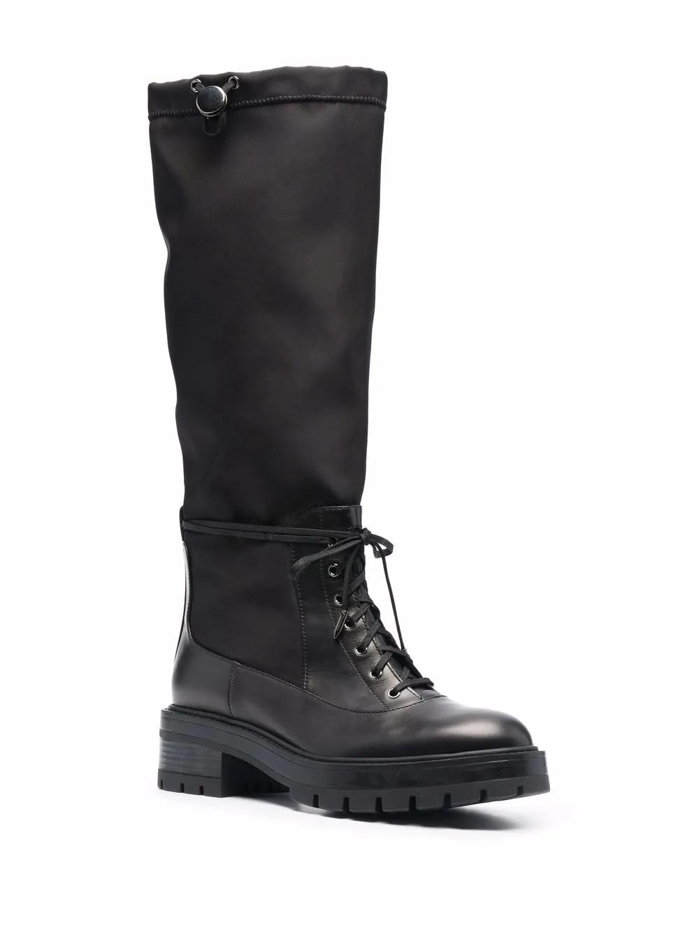 black leather knee-length drawstring fastening front lace-up fastening round toe low ridged heel