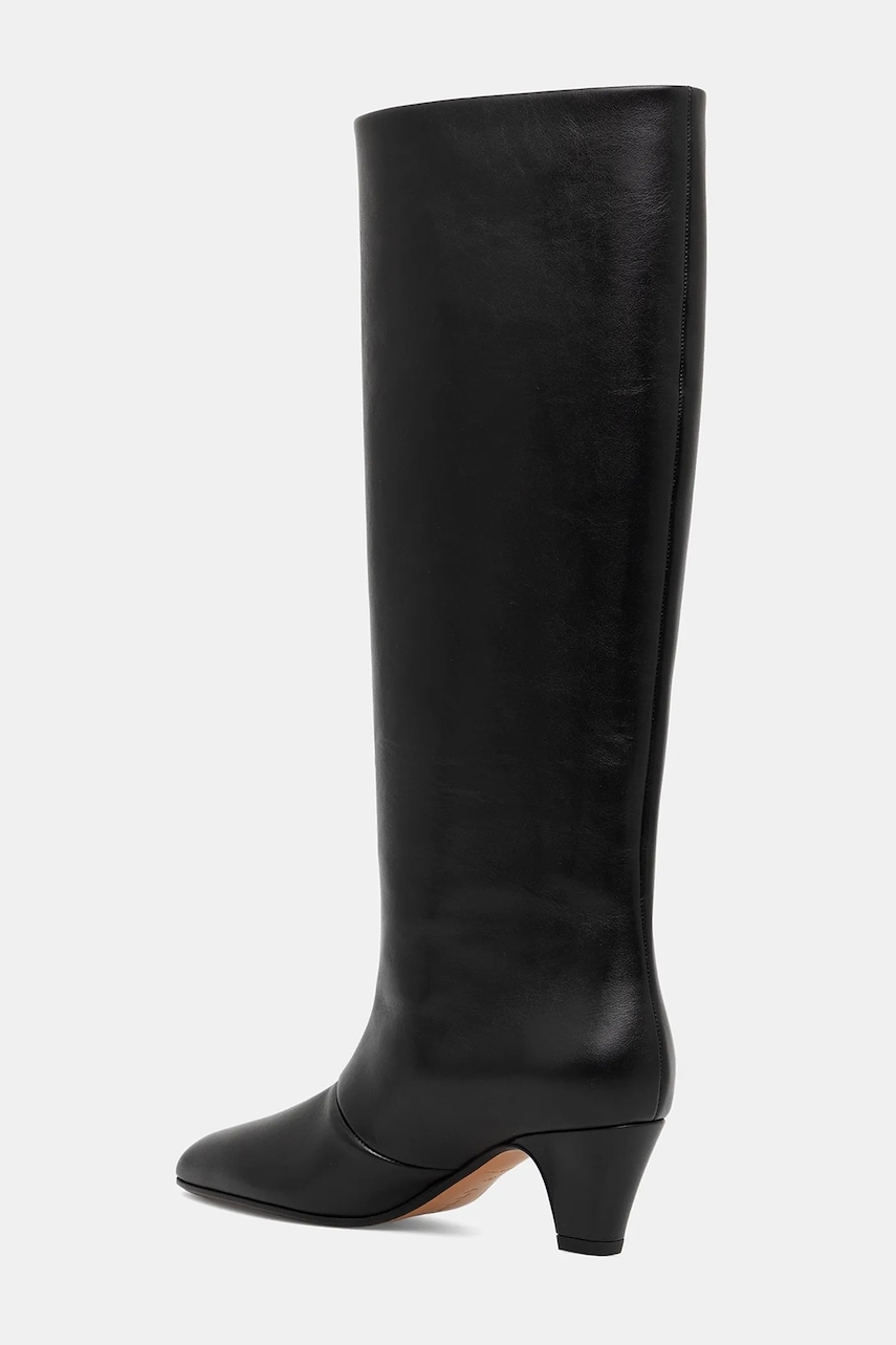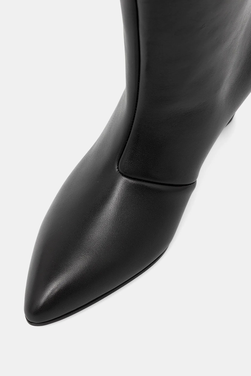 - Spiczasty, usztywniony nosek. - Model na obcasie typu słupek. - Mocno usztywniony zapiętek stabilizuje piętę i utrzymuje stopę w bucie, tak aby nie wysuwała się podczas ruchu. - Skórzane wnętrze. - Skórzana podeszwa. - Obwód cholewki: 40 cm. - Wysokość cholewki: 42 cm. - Wysokość obcasa: 6 cm. - Długość wkładki wynosi: 25 cm. - Wymiary podane dla rozmiaru: 37.