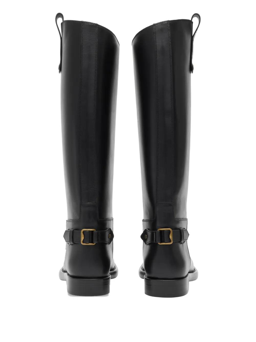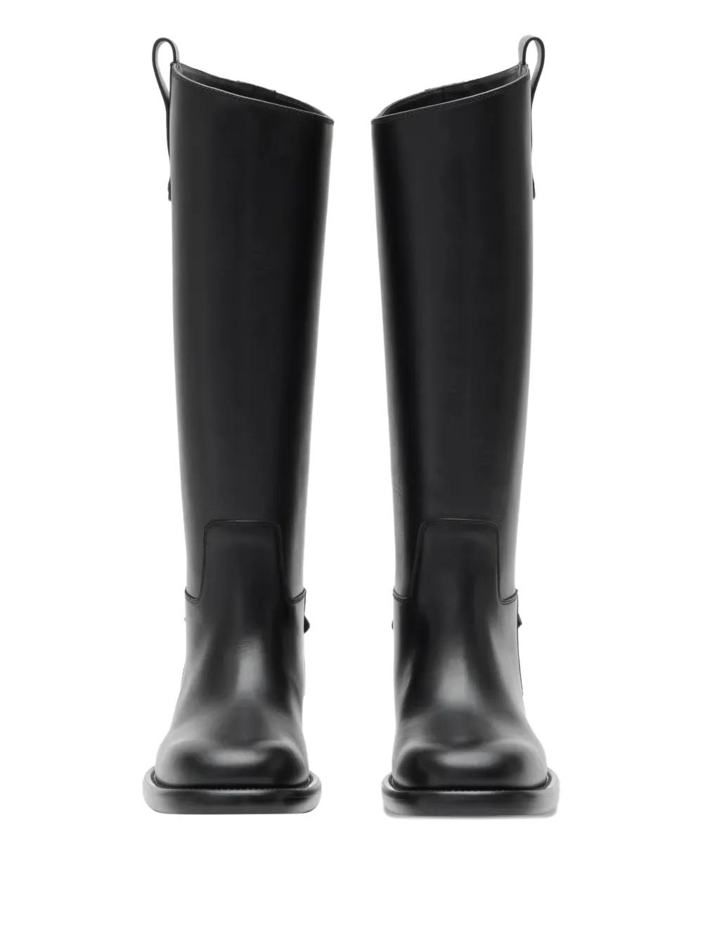 black calf-leather upper engraved Burberry lettering buckle Equestrian Knight Design sole pull tabs rounded toe