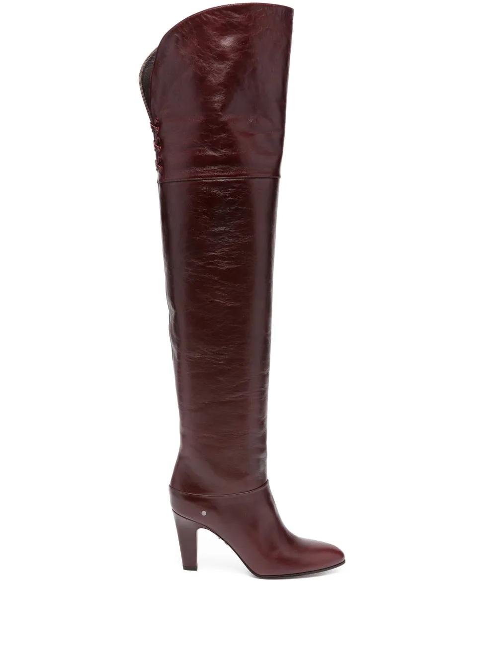 dark red calf leather high heel pointed toe thigh-high shaft back laced detail