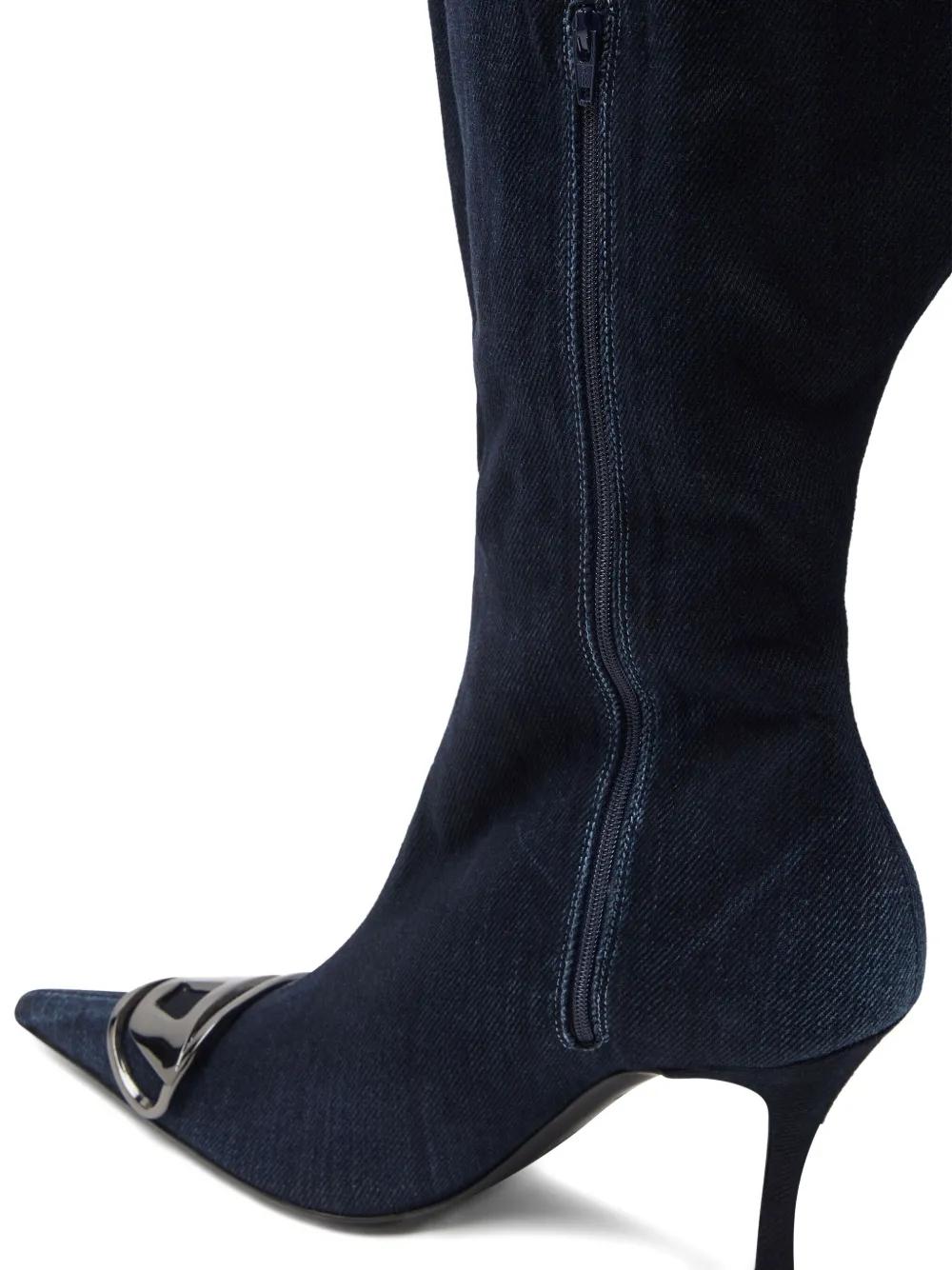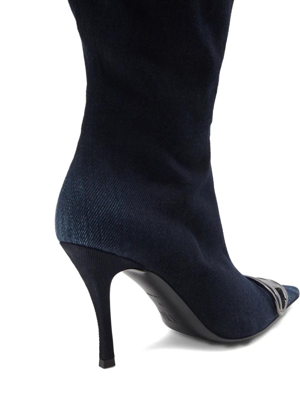 indigo blue denim pointed toe stiletto heel side zip fastening metallic buckle detail