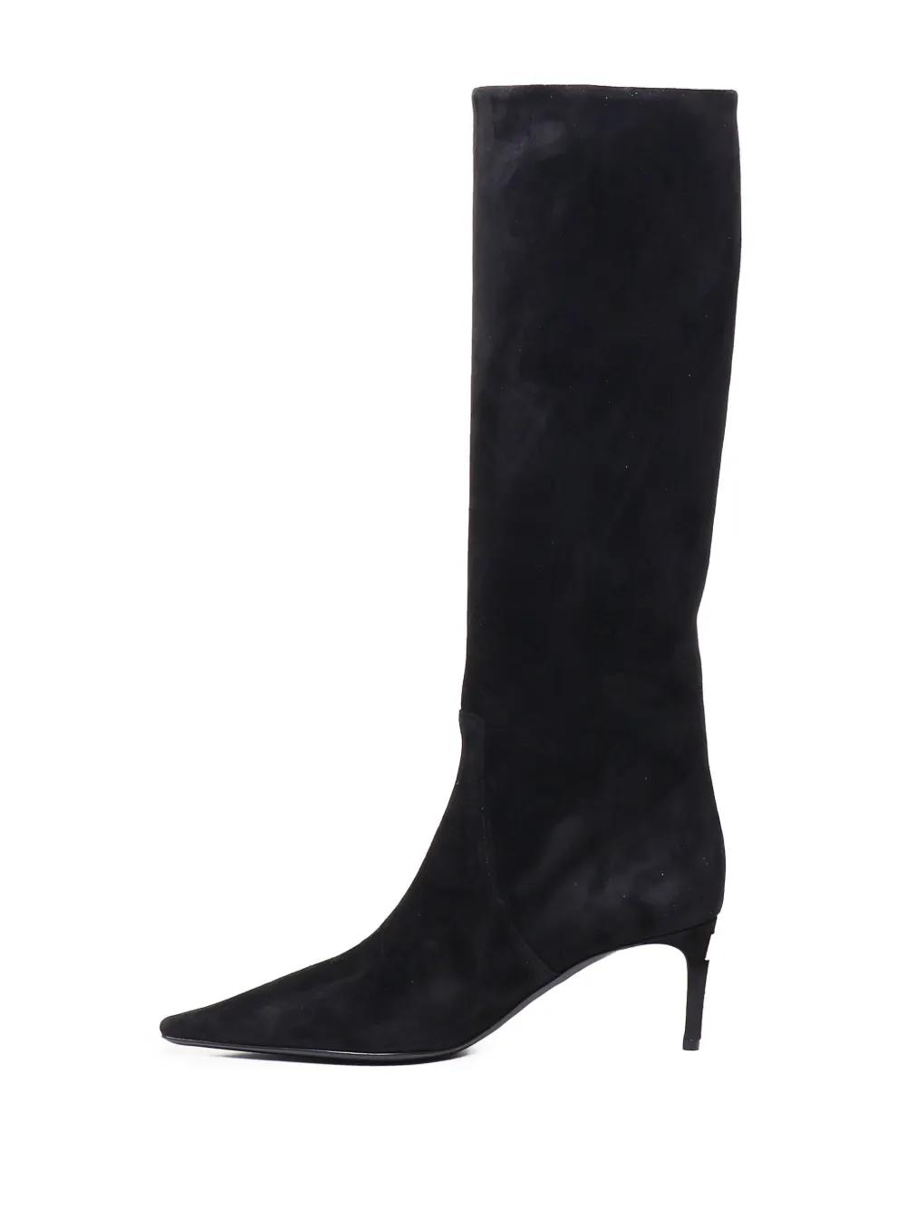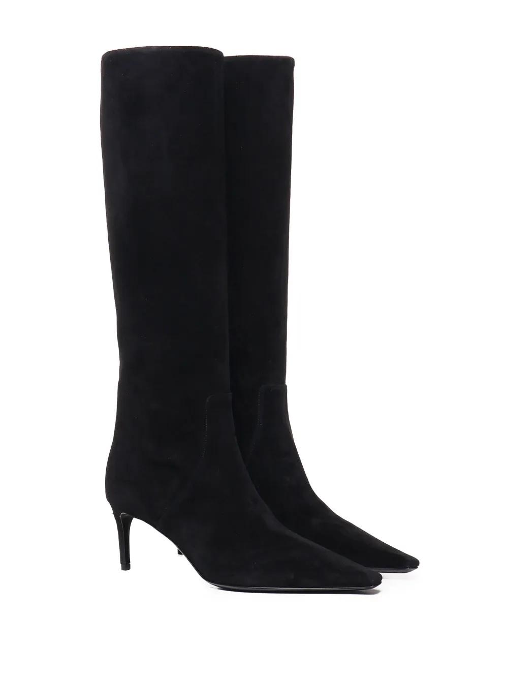 black suede 70mm stiletto heel logo plaque knee-high pointed toe leather lining leather sole