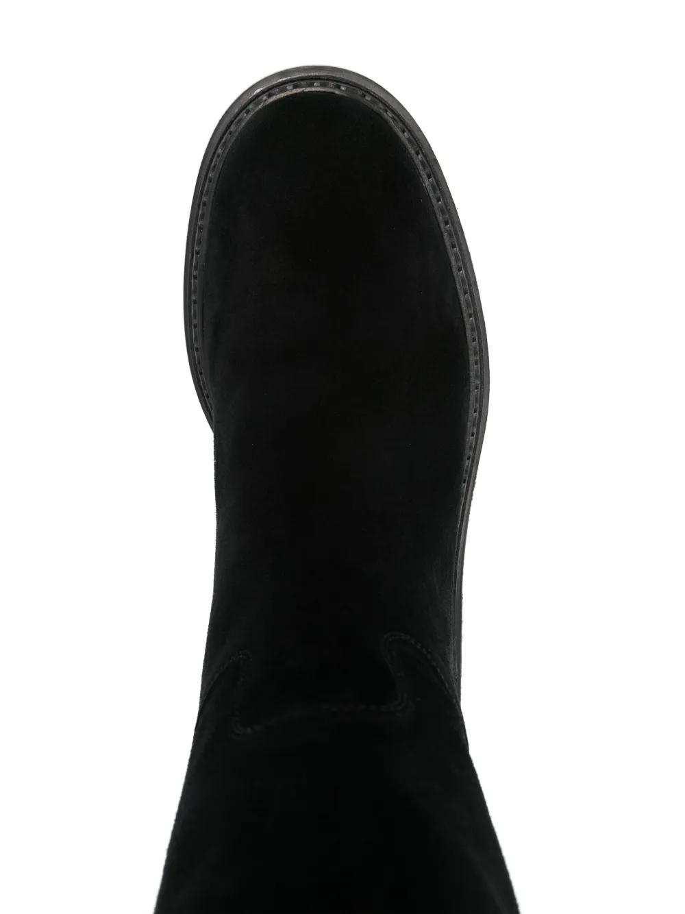 black calf suede signature DG plaque embellished strap pull-on style stacked heel knee-high pull-tab at the heel round toe branded leather insole rubber sole