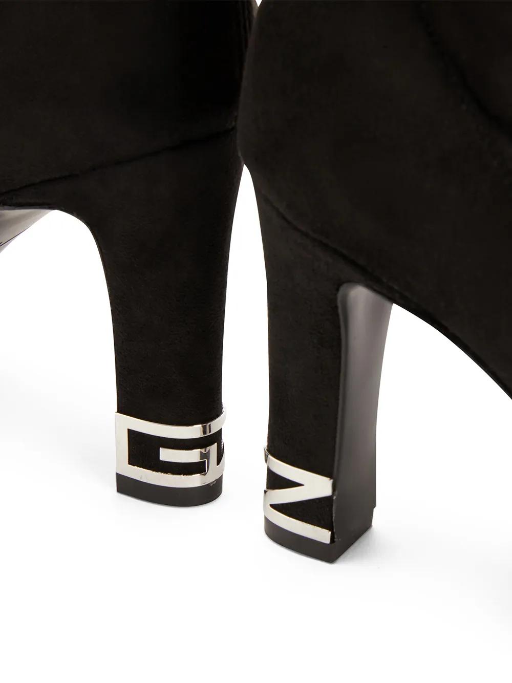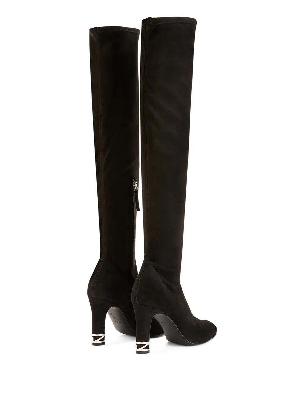 black leather above-knee length silver-tone logo lettering short side zip fastening pointed toe high heel