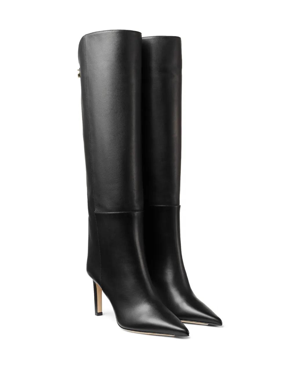 black calf leather/lambskin/goatskin panelled design pointed toe press-stud fastening to the rear 85mm high heel knee-high Wardrobe Icon