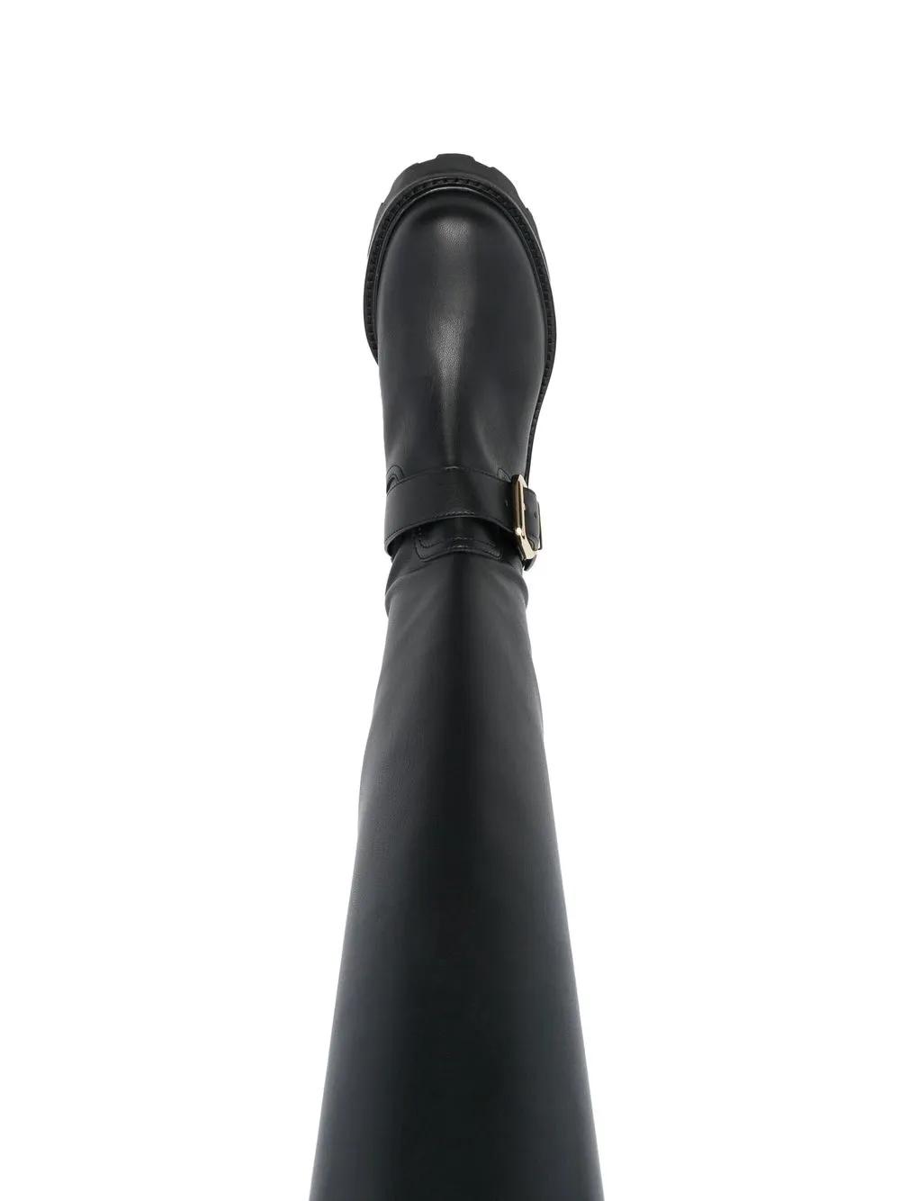 black calf leather logo plaque side buckle fastening knee-high round toe ridged rubber sole