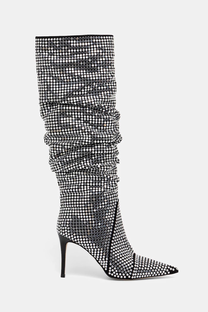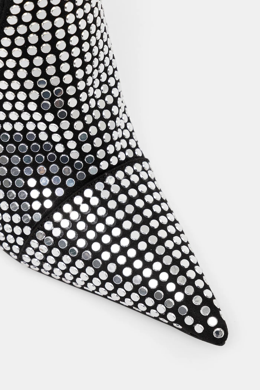 - Spiczasty, usztywniony nosek. - Usztywniony zapiętek. - Wsuwany model. - Model na obcasie typu szpilka. - Model z ozdobną aplikacją. - Skórzana wkładka jest komfortowa dla stopy i zapobiega odparzeniom, otarciom oraz pojawianiu się nieprzyjemnego zapachu. - Wysokość obcasa: 9 cm. - Obwód cholewki: 39 cm. - Wysokość cholewki: 41 cm. - Długość wkładki wynosi: 23,5 cm. - Wymiary podane dla rozmiaru: 37.