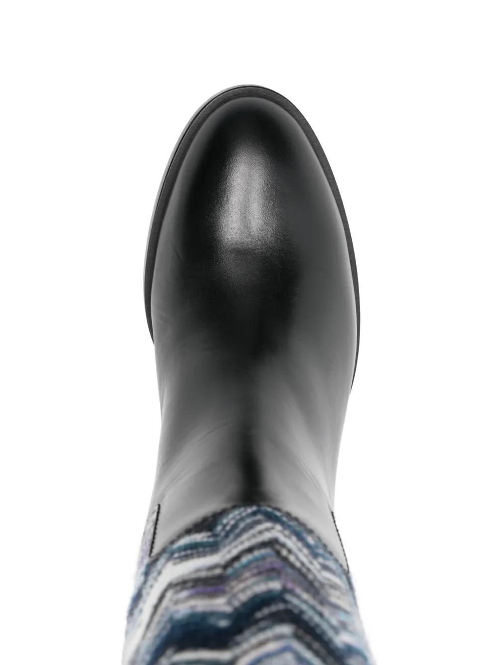 blue and multicolour zigzag pattern block heel side zip fastening knee-high pull tabs