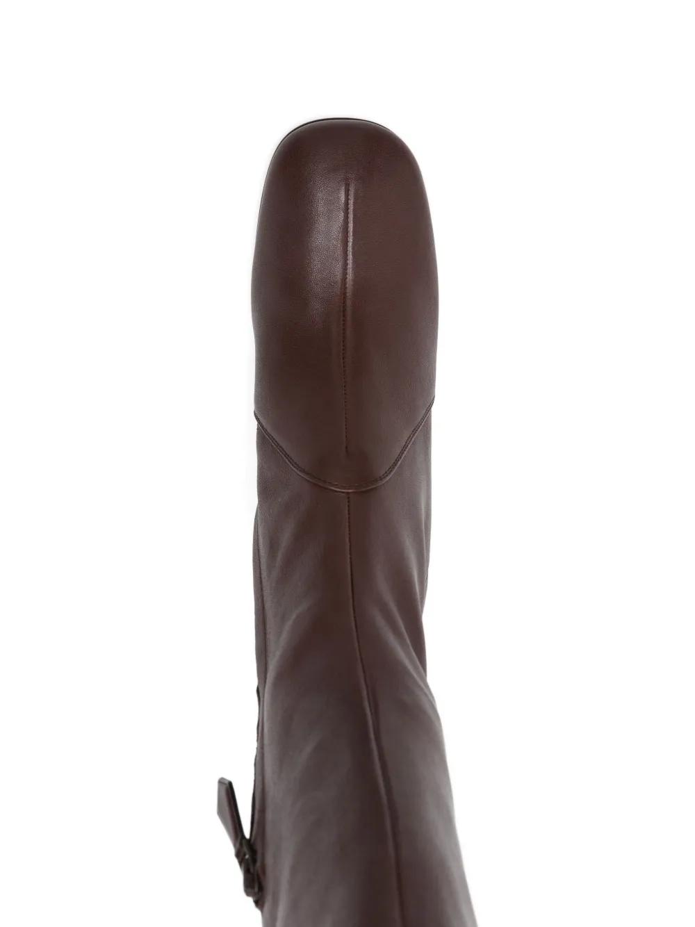 brown knee-high block heel side zip fastening buckle-fastening strap square toe