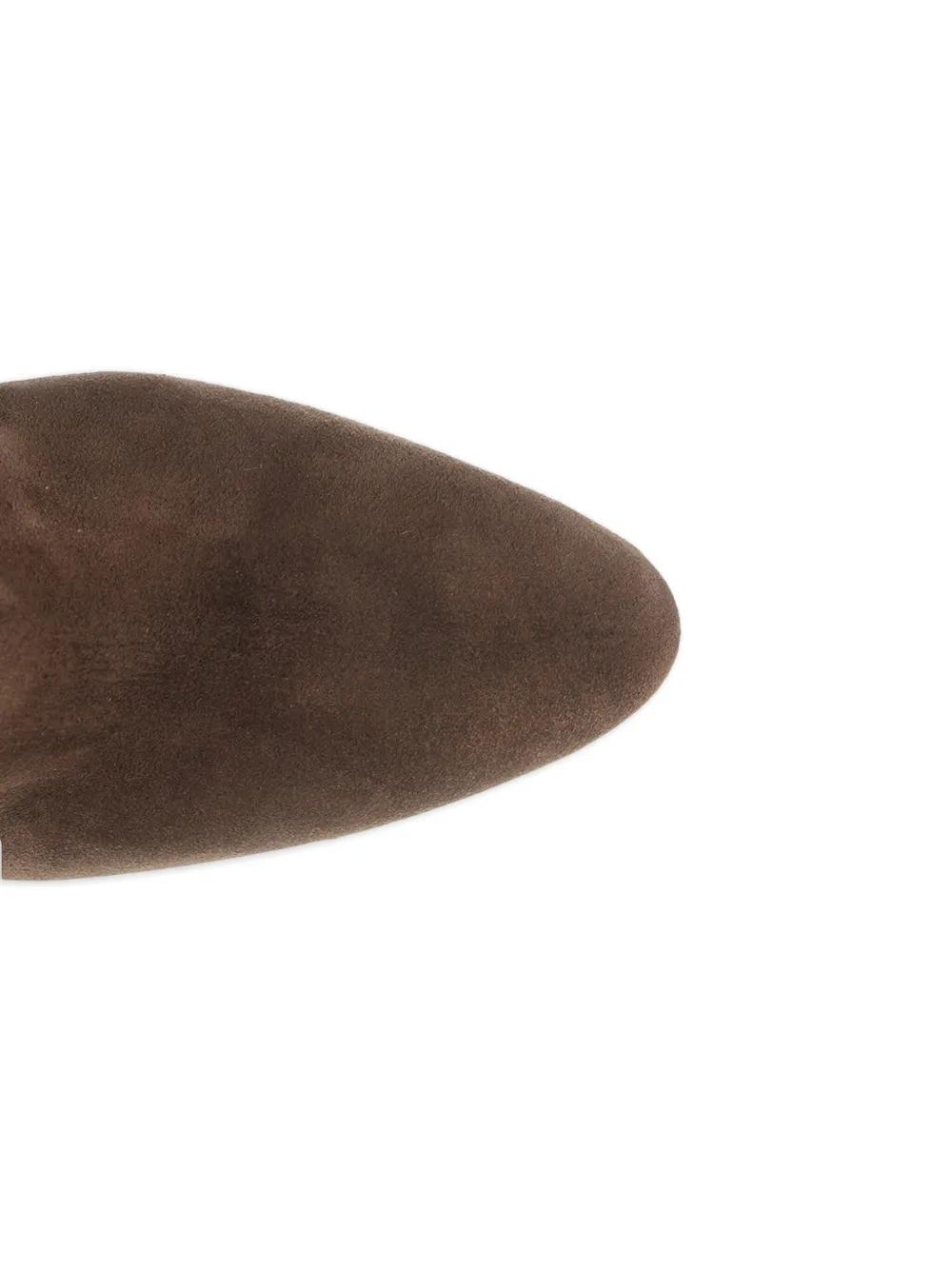 caramel brown suede block heel thigh-high pointed toe