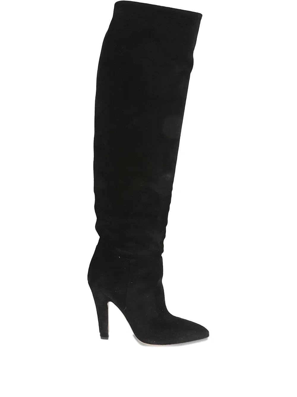 black leather round toe stiletto heel over-the-knee style gathered detail