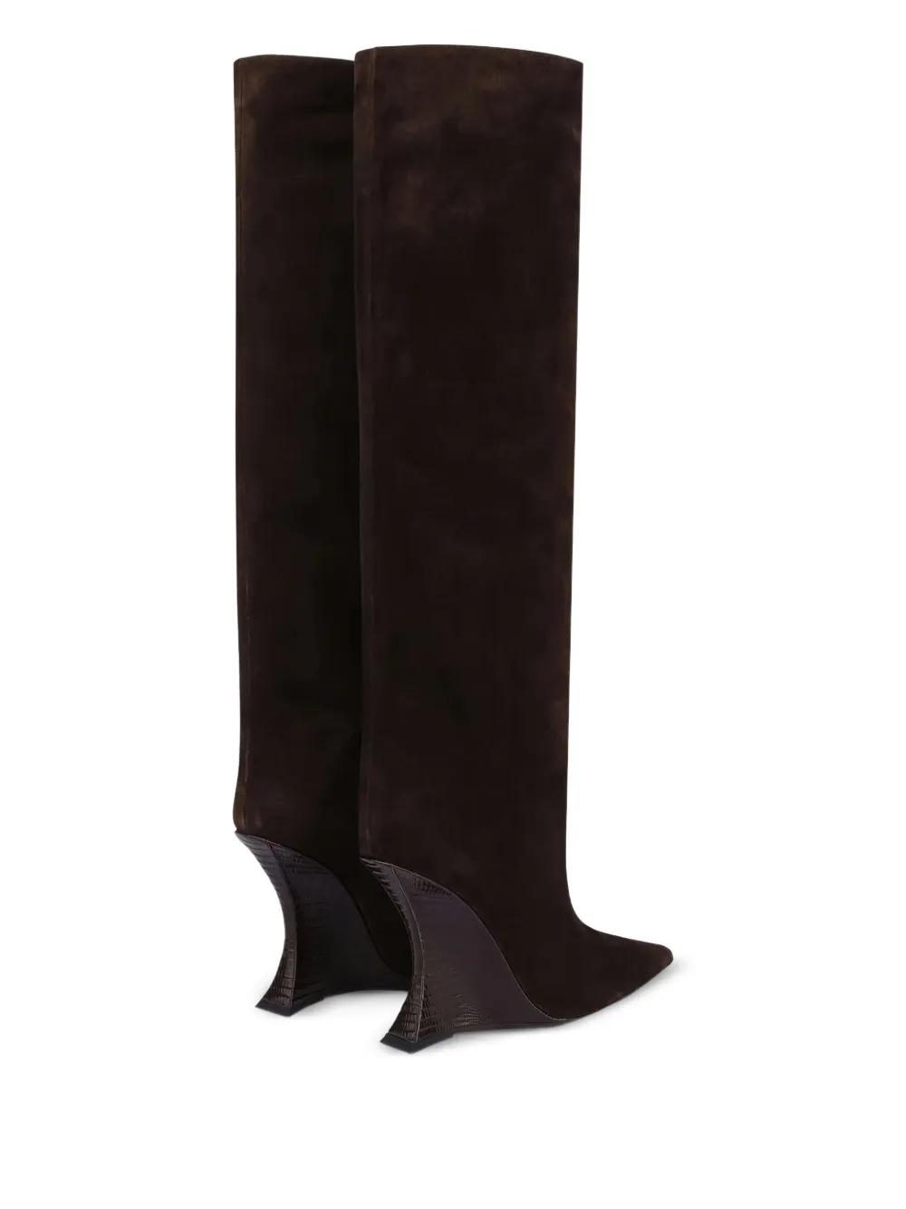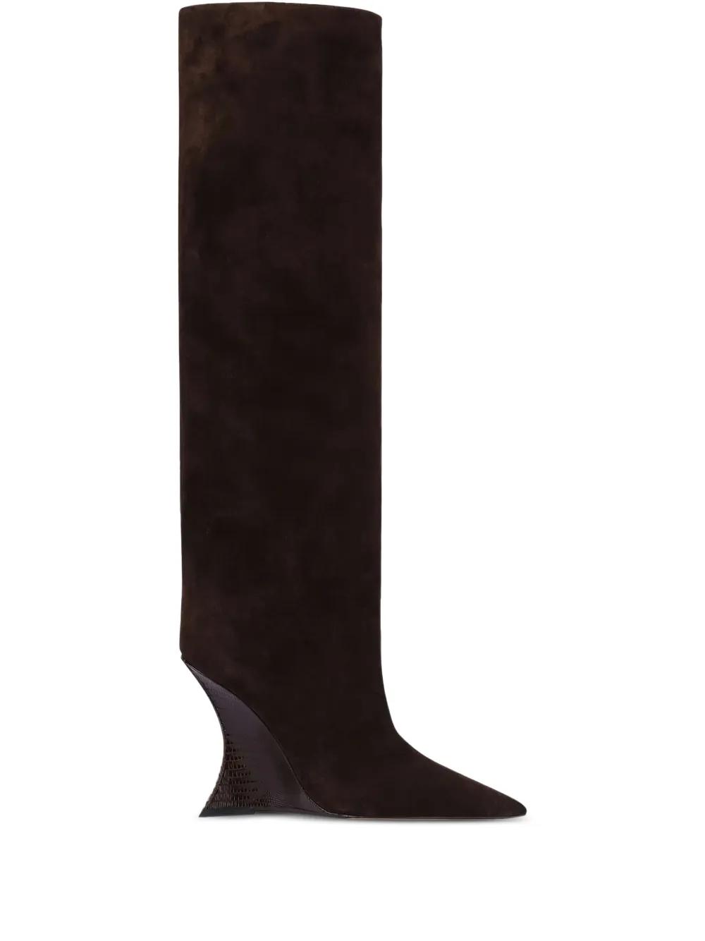 brown suede pointed toe knee-high wedge heel