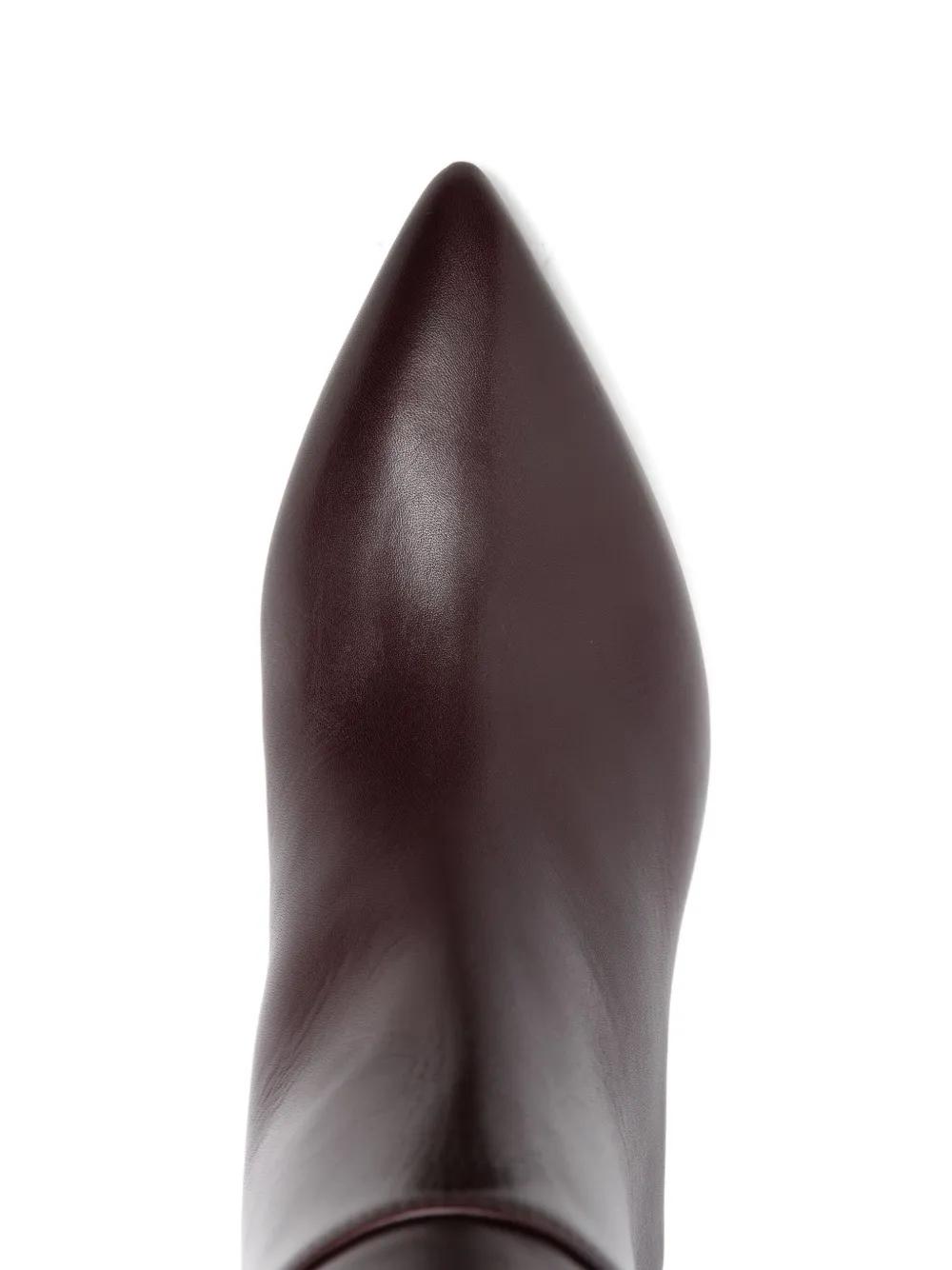 dark red knee-high pointed toe mid stiletto heel panelled design