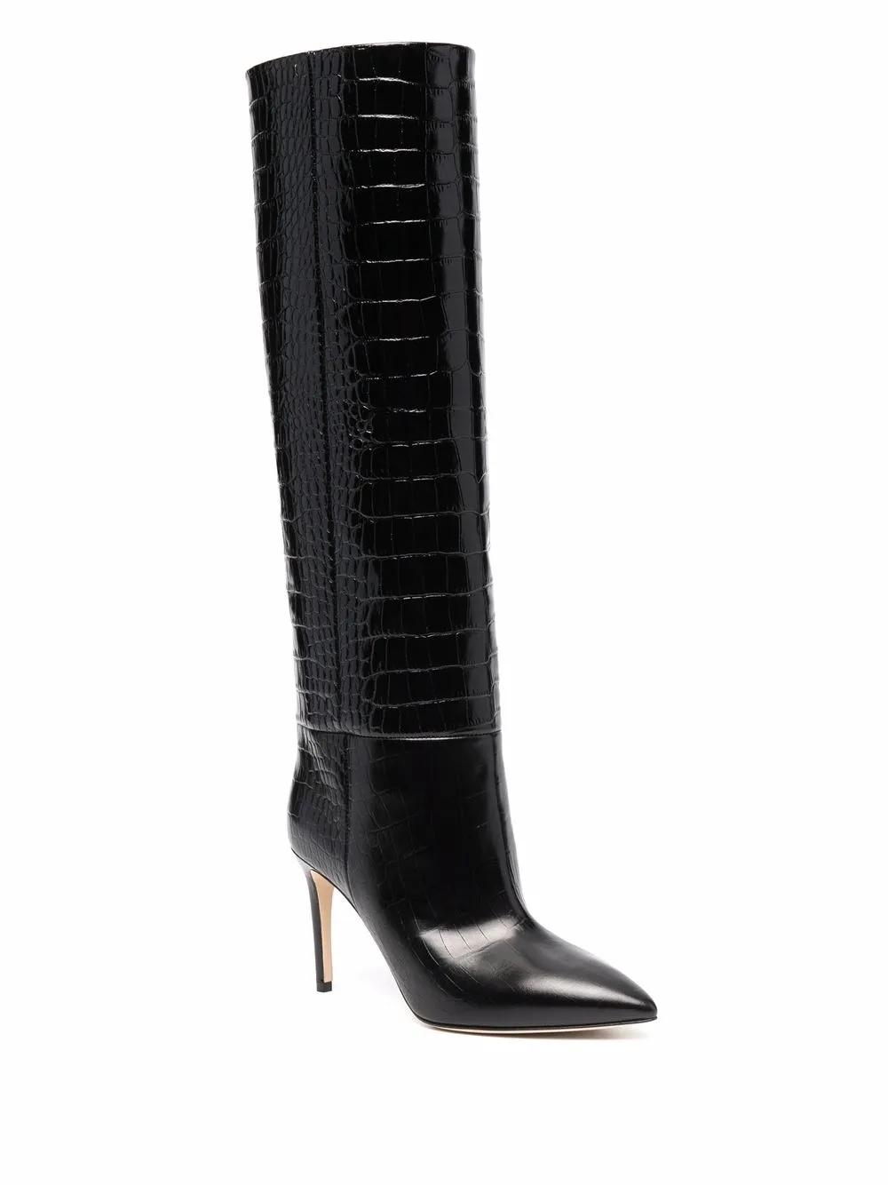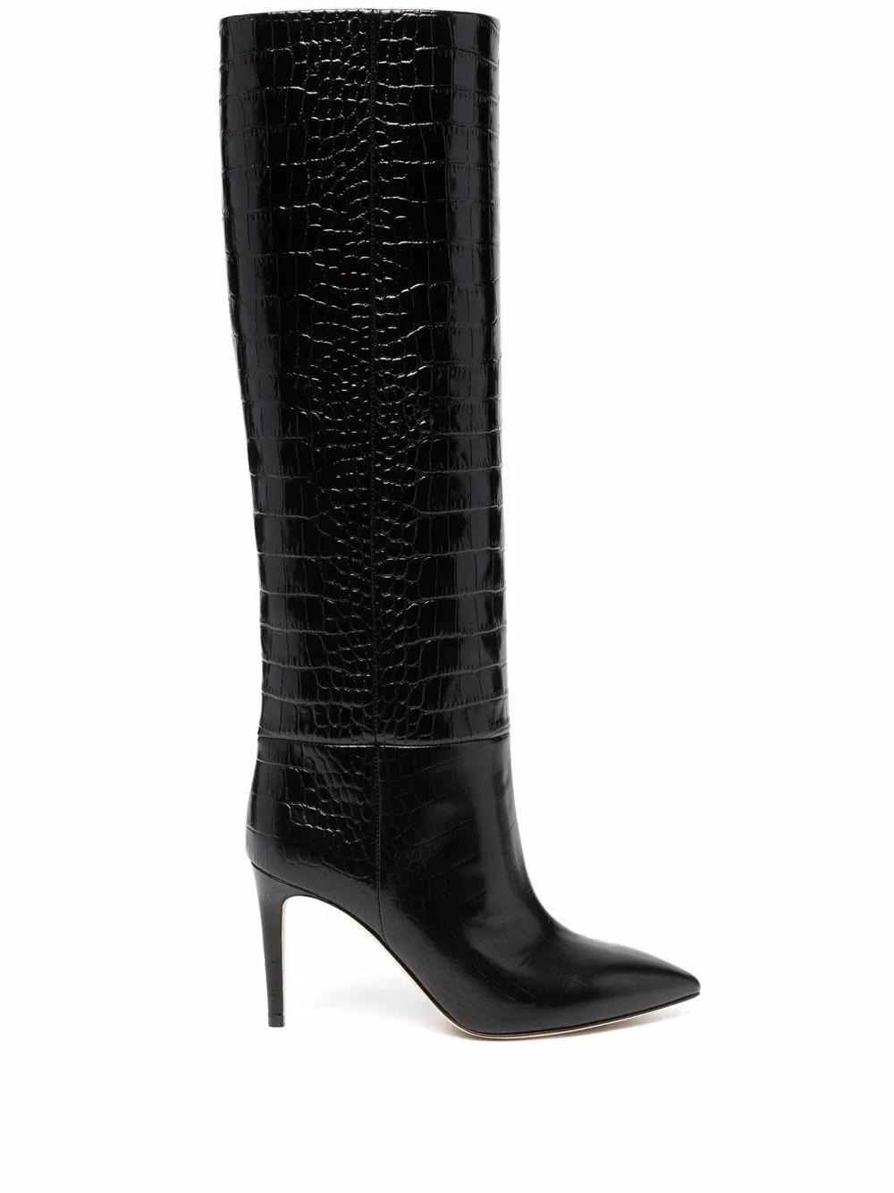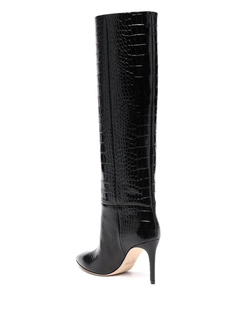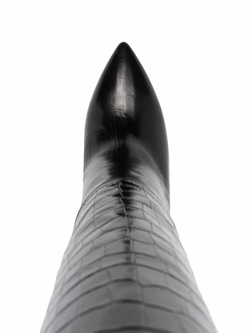 true black leather crocodile effect 85mm high stiletto heel below-knee length pointed toe branded leather insole leather sole slip-on style