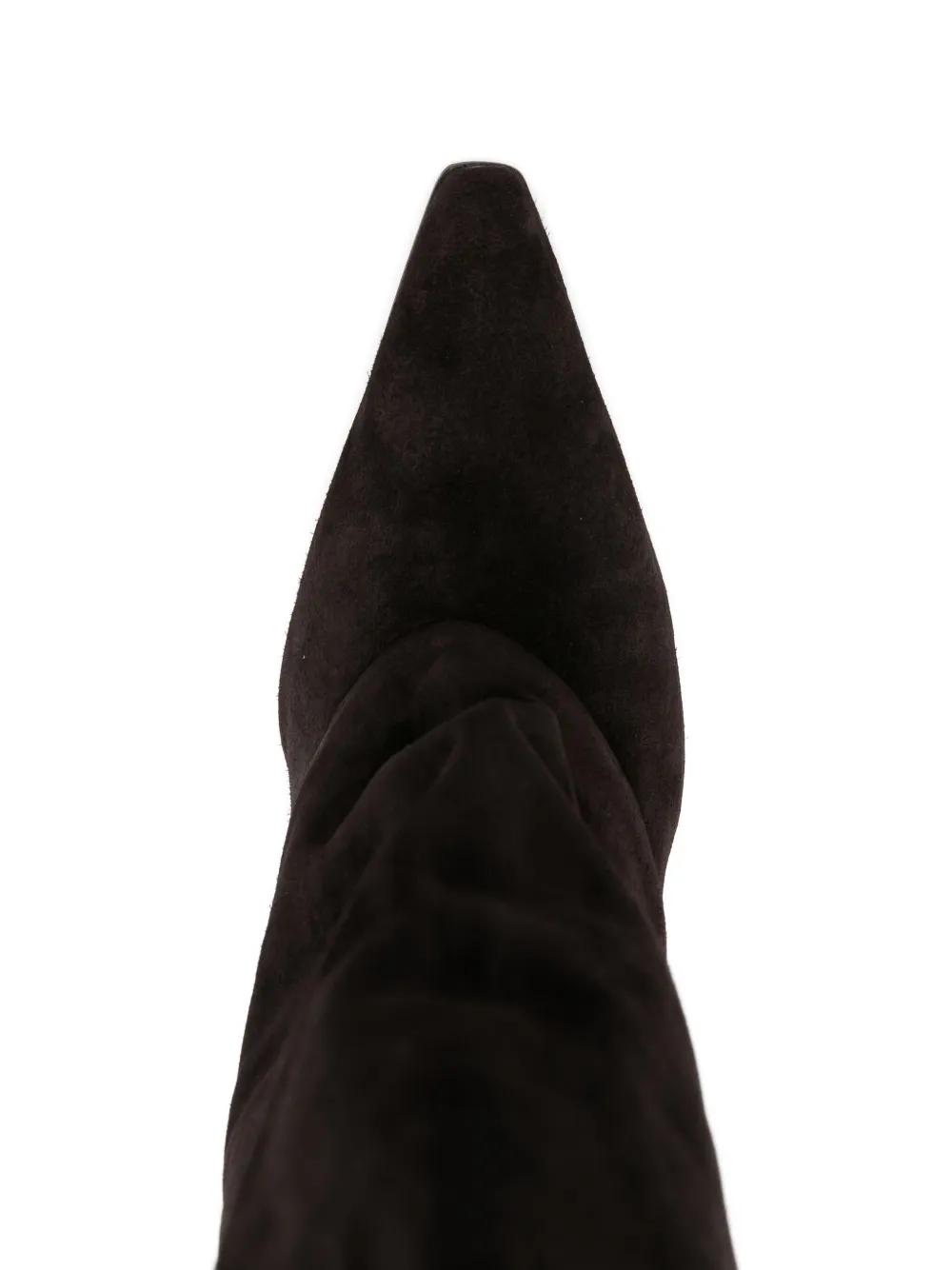 dark brown pointed toe block heel knee-high slouch design pull-on style