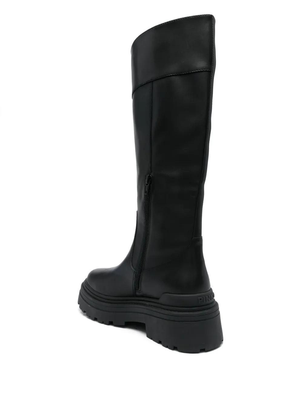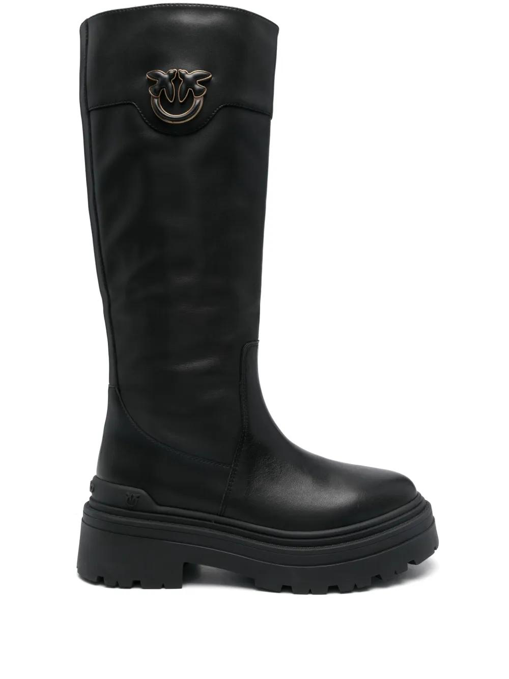 black calf leather smooth grain panelled design side zip fastening Love Birds plaque to the side round toe branded insole chunky rubber sole knee-high