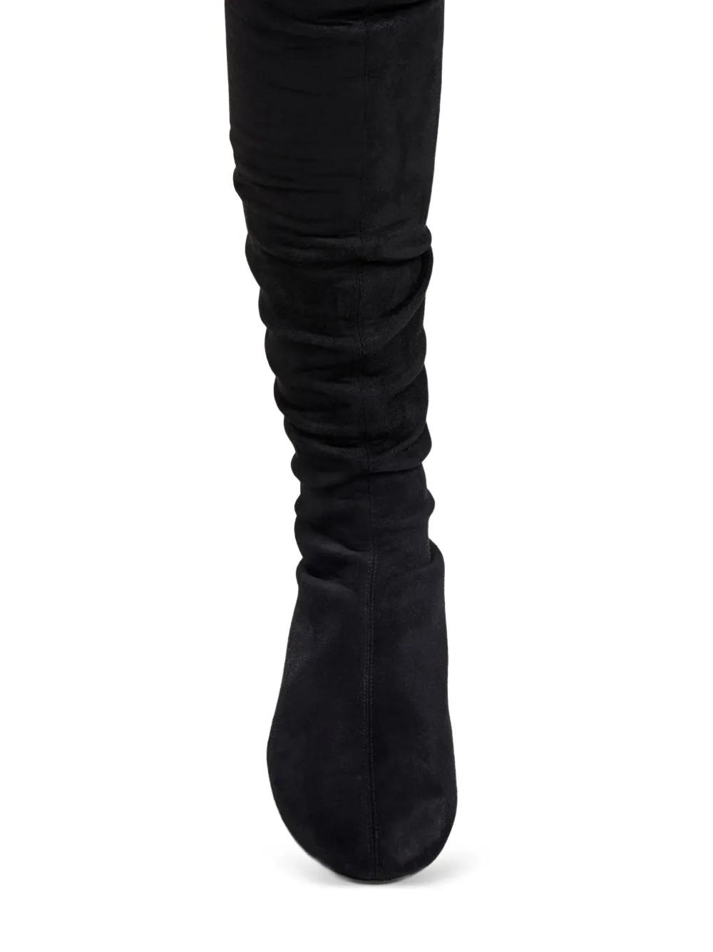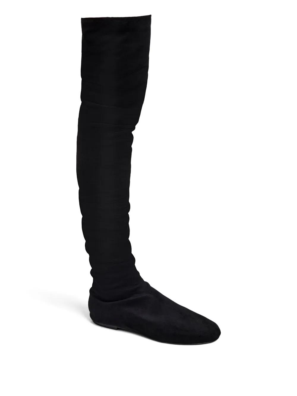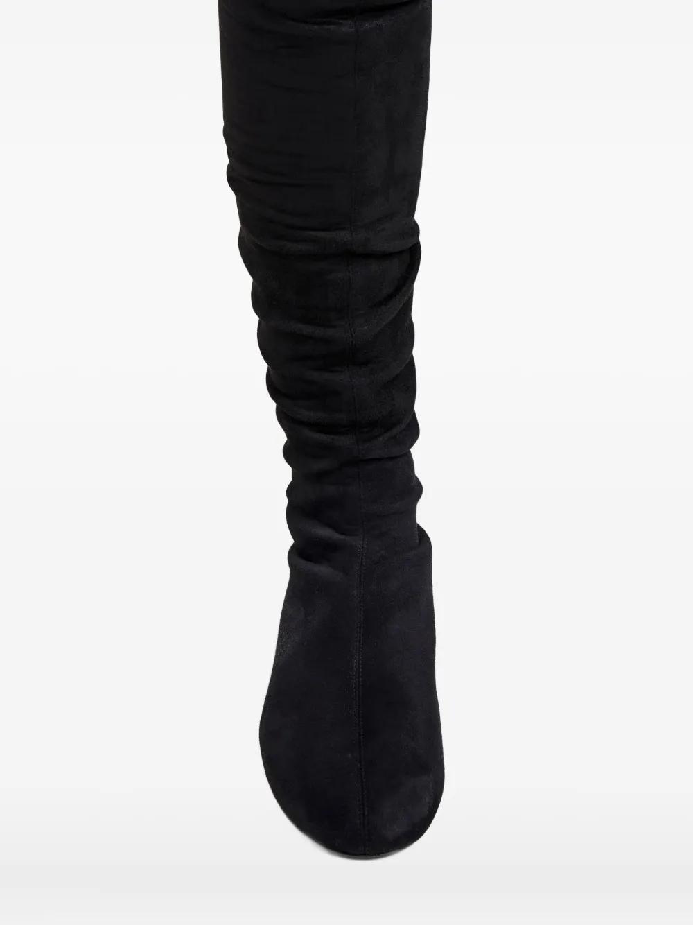 black over-the-knee length ruched detailing round toe slip-on style flat sole