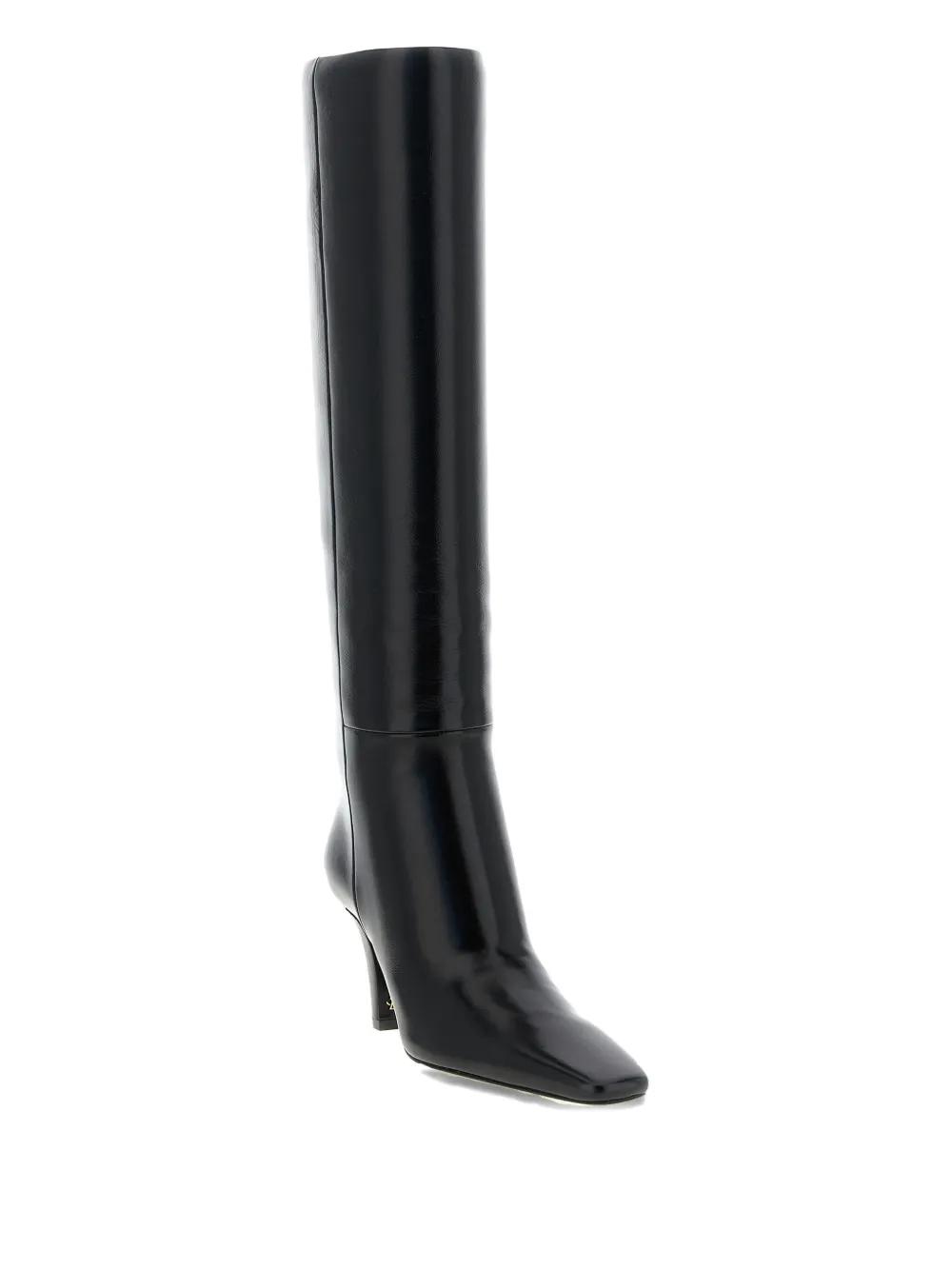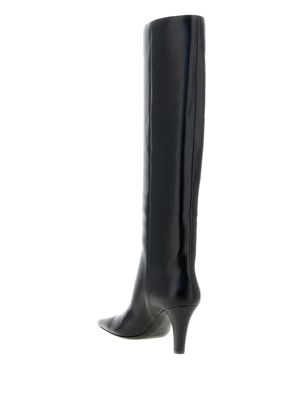 black smooth leather metal logo pointed toe tube leg tapered heel