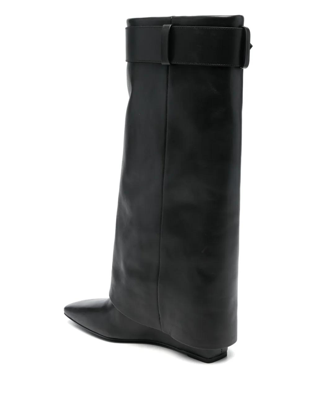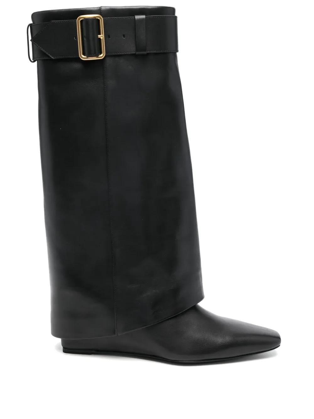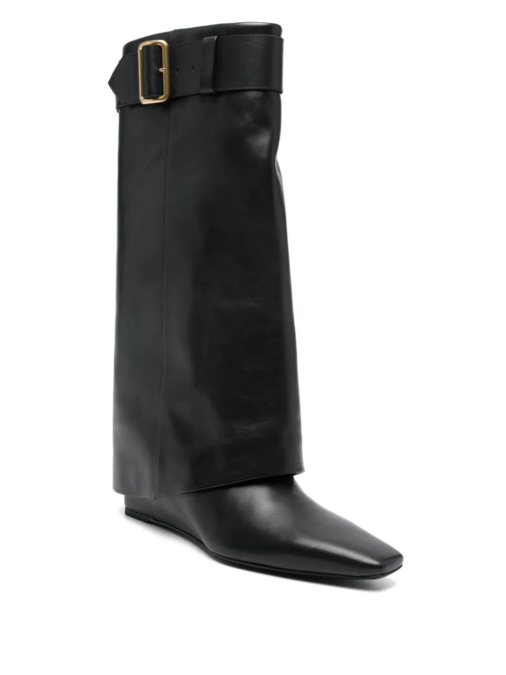 black calf leather smooth grain layered design 70mm wedge heel decorative buckle detail pointed toe leather sole
