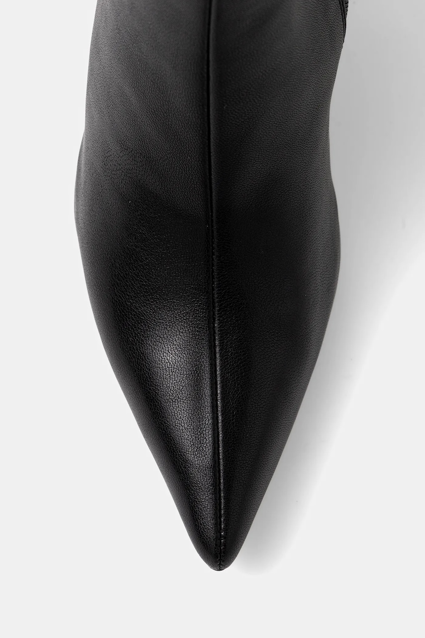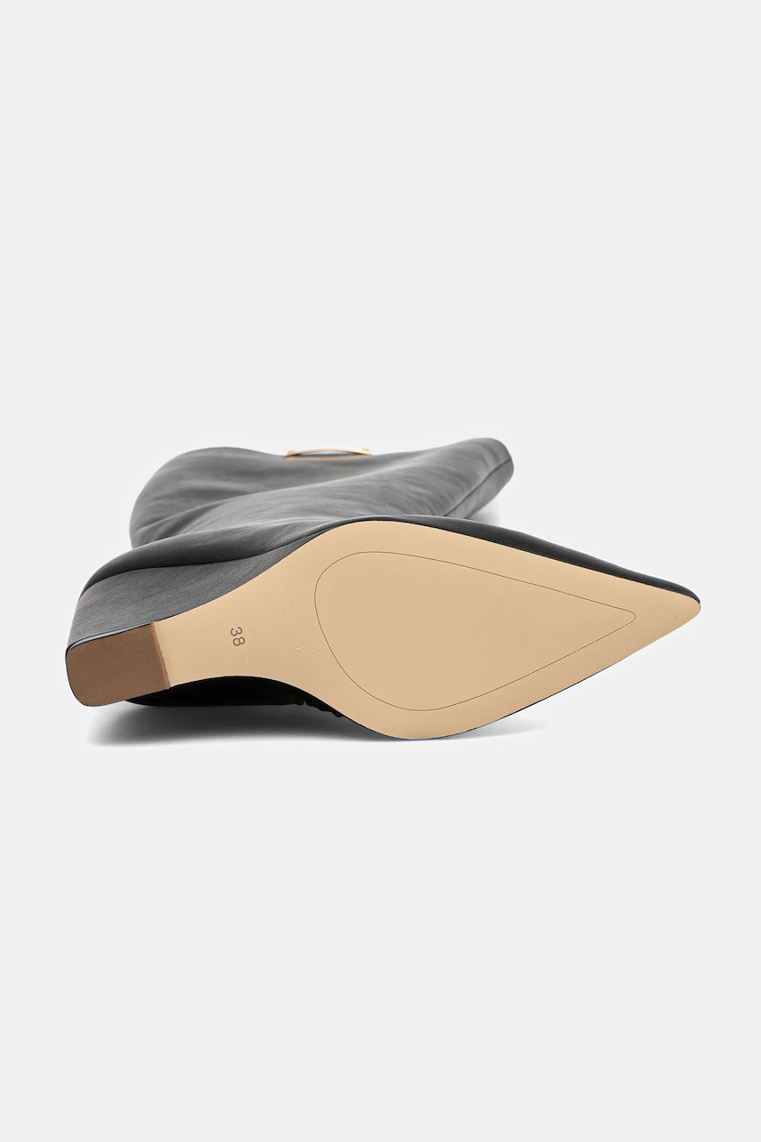 - Spiczasty, usztywniony nosek. - Usztywniony zapiętek zapewnia doskonałe wsparcie kostki i pięty. - Boczne zapięcie na suwak. - Model na koturnie. - Gumowa podeszwa zewnętrzna jest wytrzymała i odporna na uszkodzenia. - Komfortowe wnętrze. - Obwód cholewki: 40 cm. - Wysokość cholewki: 37 cm. - Wysokość koturna: 10 cm. - Długość wkładki wynosi: 25 cm. - Wymiary podane dla rozmiaru: 38.