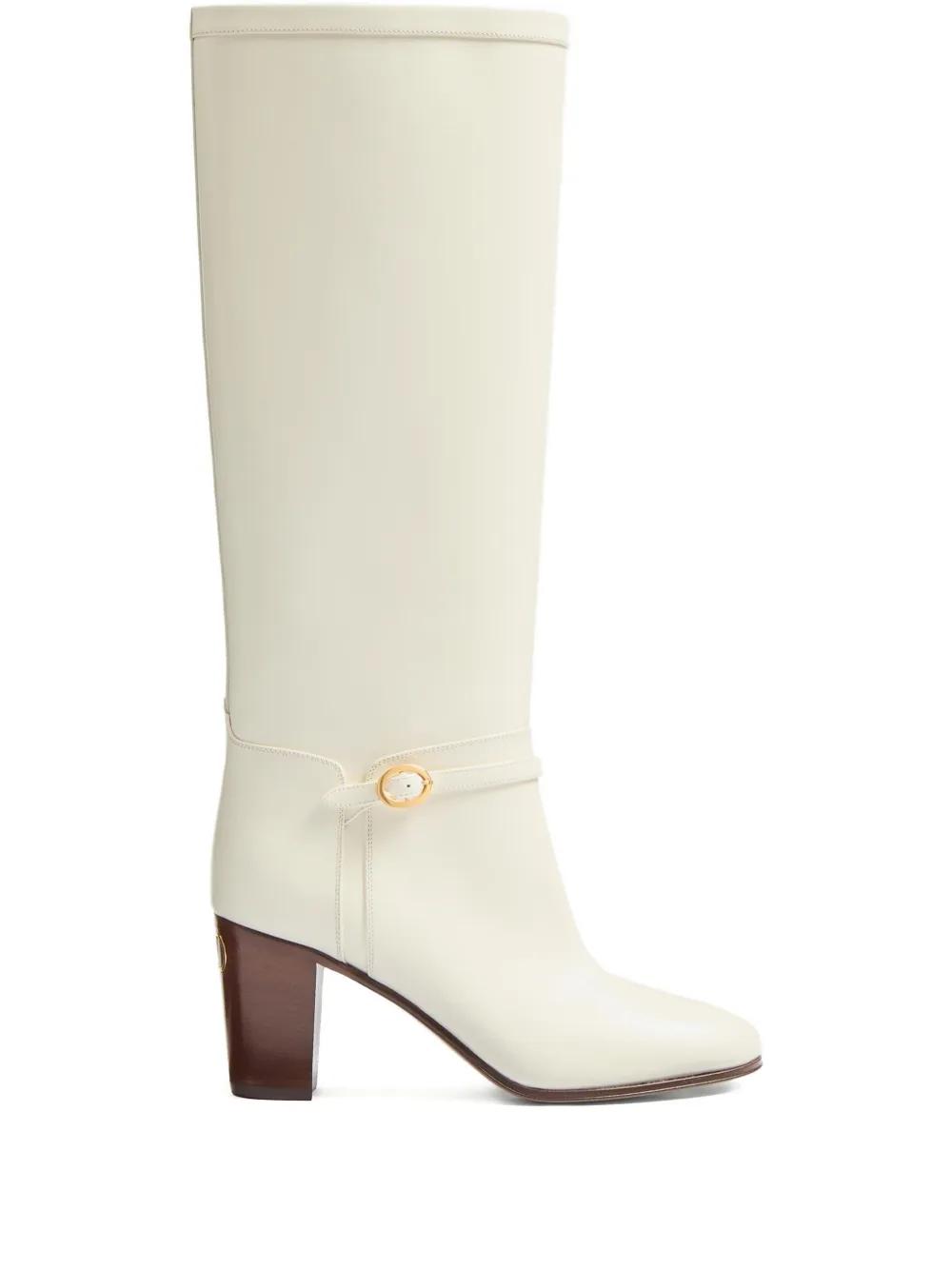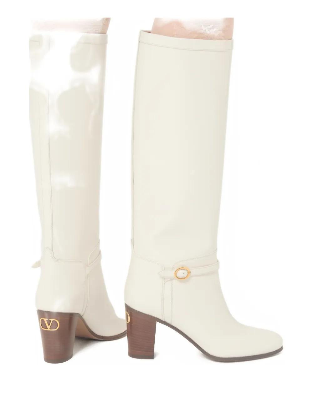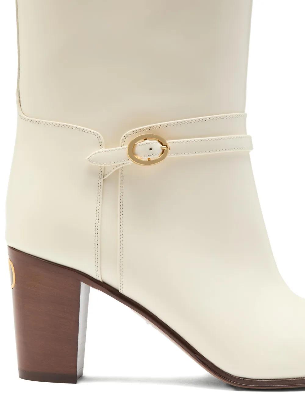 white calf leather mid heel signature VLogo plaque buckle-fastening ankle strap below-knee length round toe