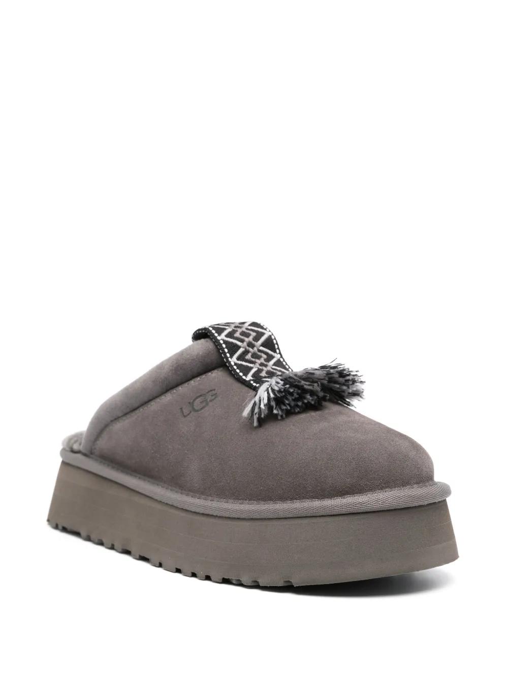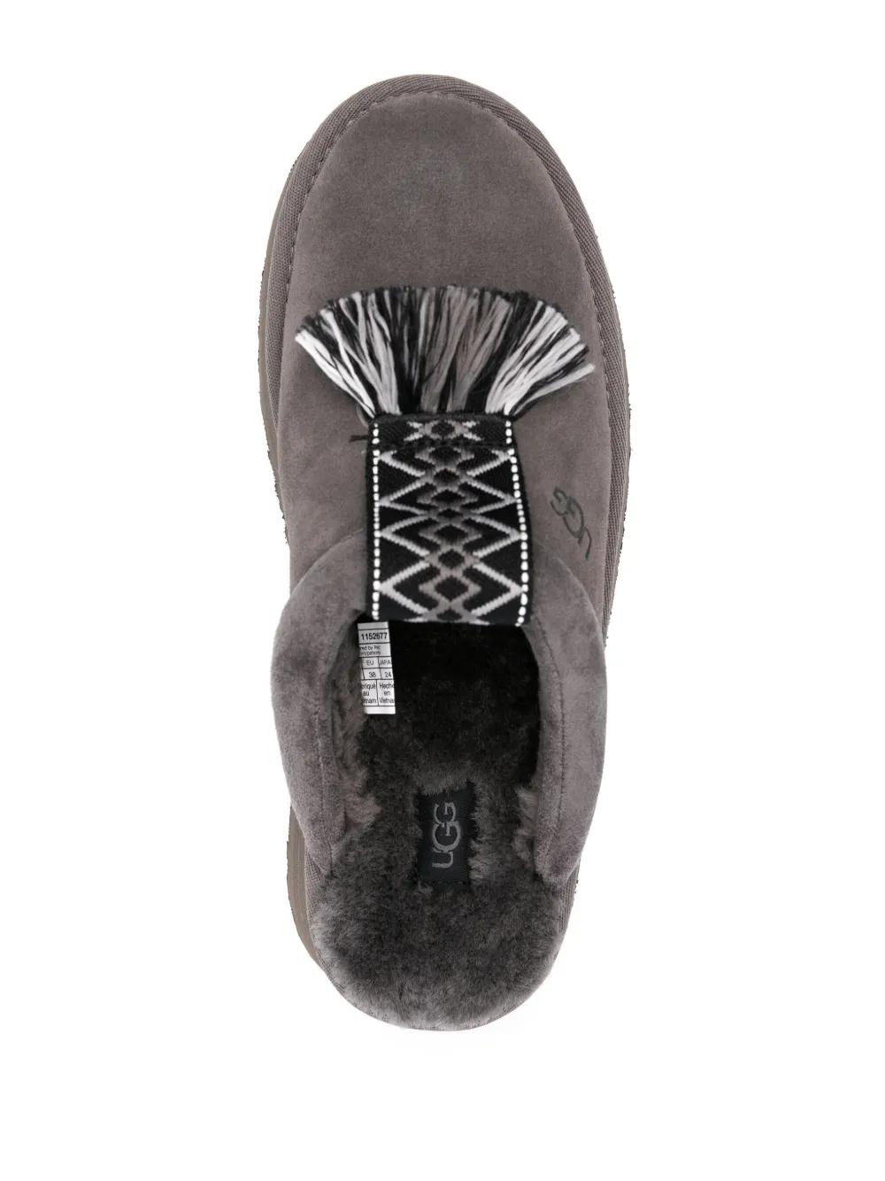 dark grey calf suede debossed logo to the side braid detailing tassel detail round toe signature UGGplush™ lining branded insole platform sugarcane EVA outsole slip-on style