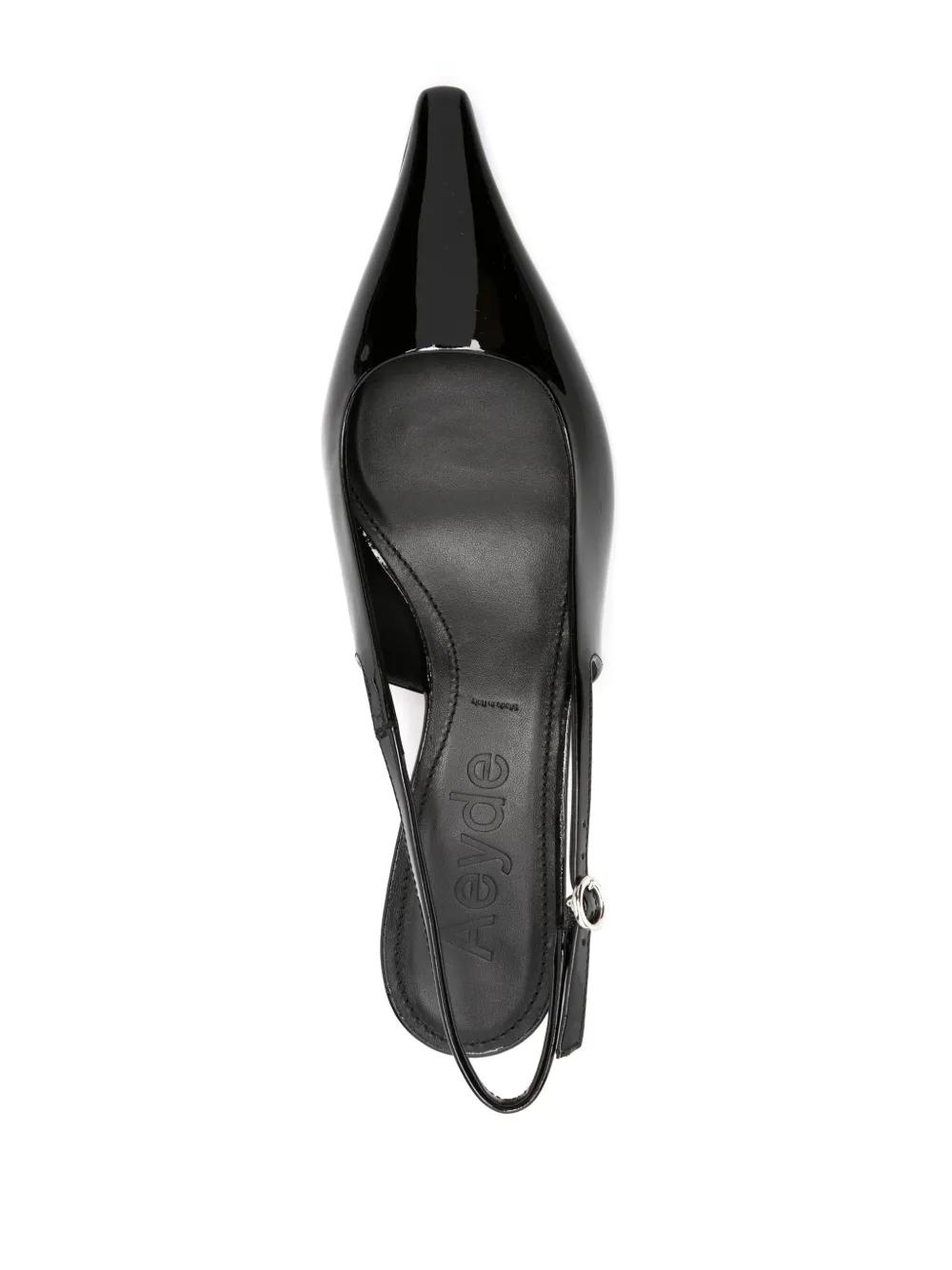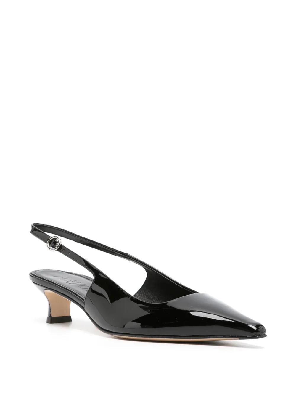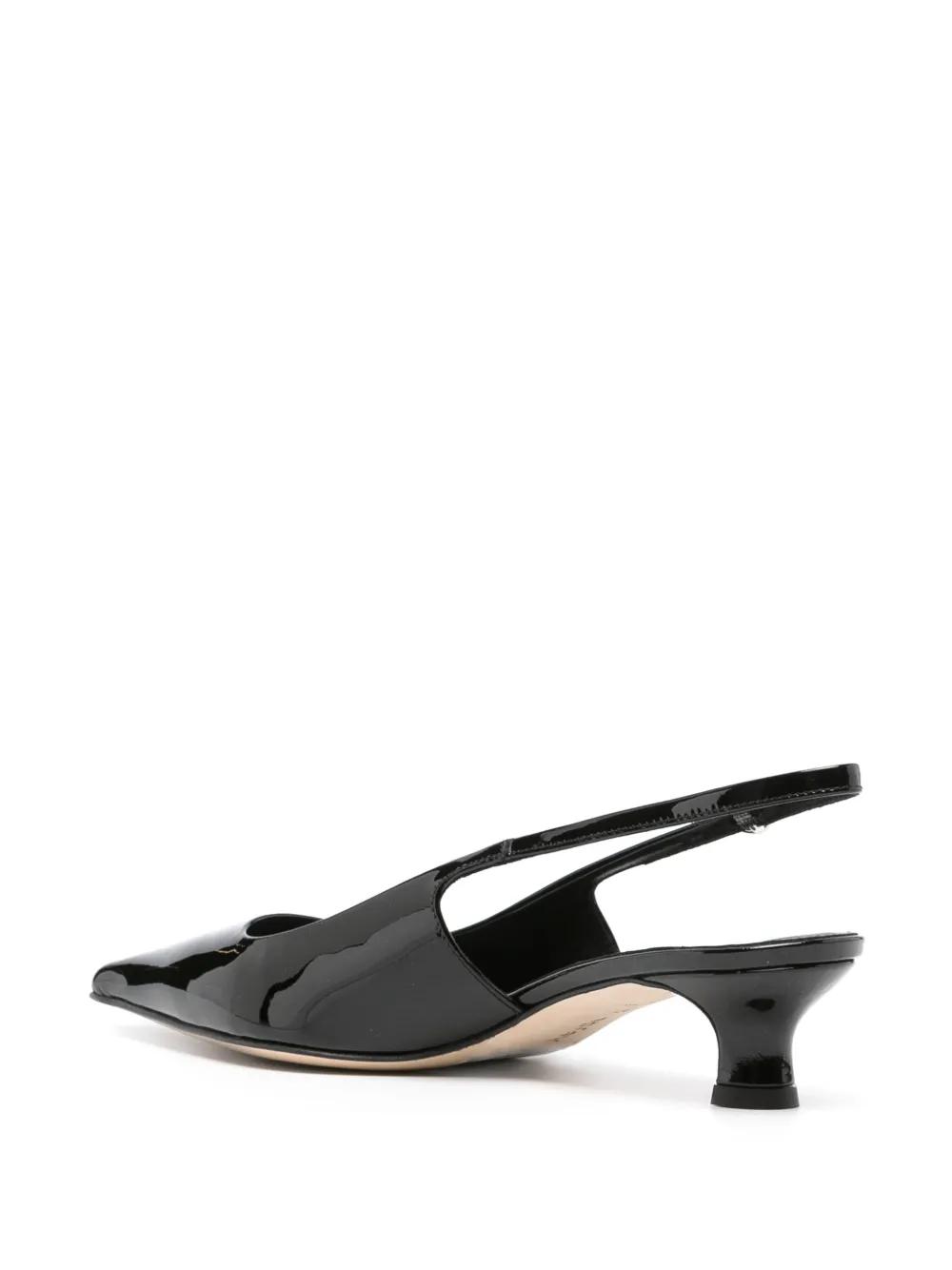 black calf leather patent finish pointed toe buckle-fastening slingback strap branded footbed low stiletto heel