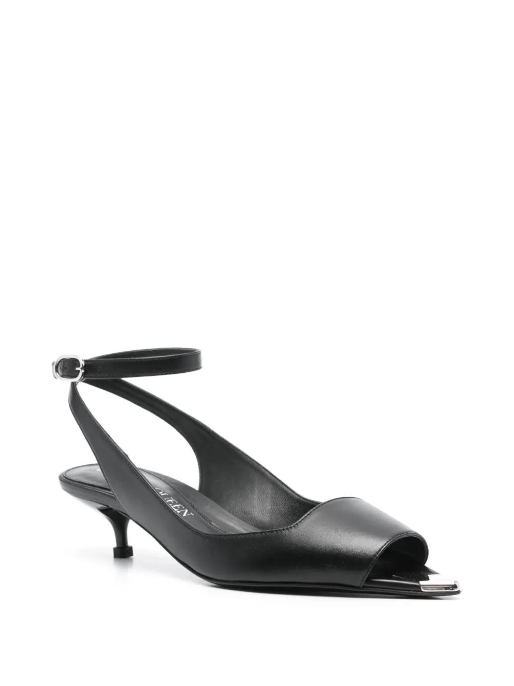 black leather silver-tone hardware metal toecap pointed toe buckle-fastening ankle strap branded insole kitten heel