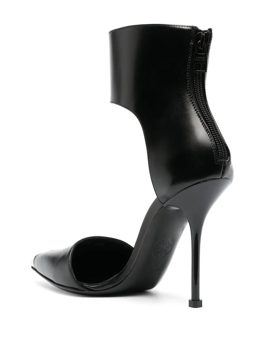 black/silver calf leather ankle-length cut-out detailing metal toecap pointed toe rear zip fastening branded leather insole 105mm high stiletto heel