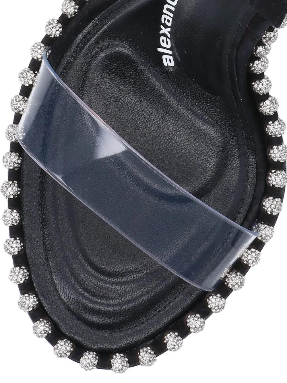 black rhinestone embellishment ankle strap open round toe branded insole stiletto heel
