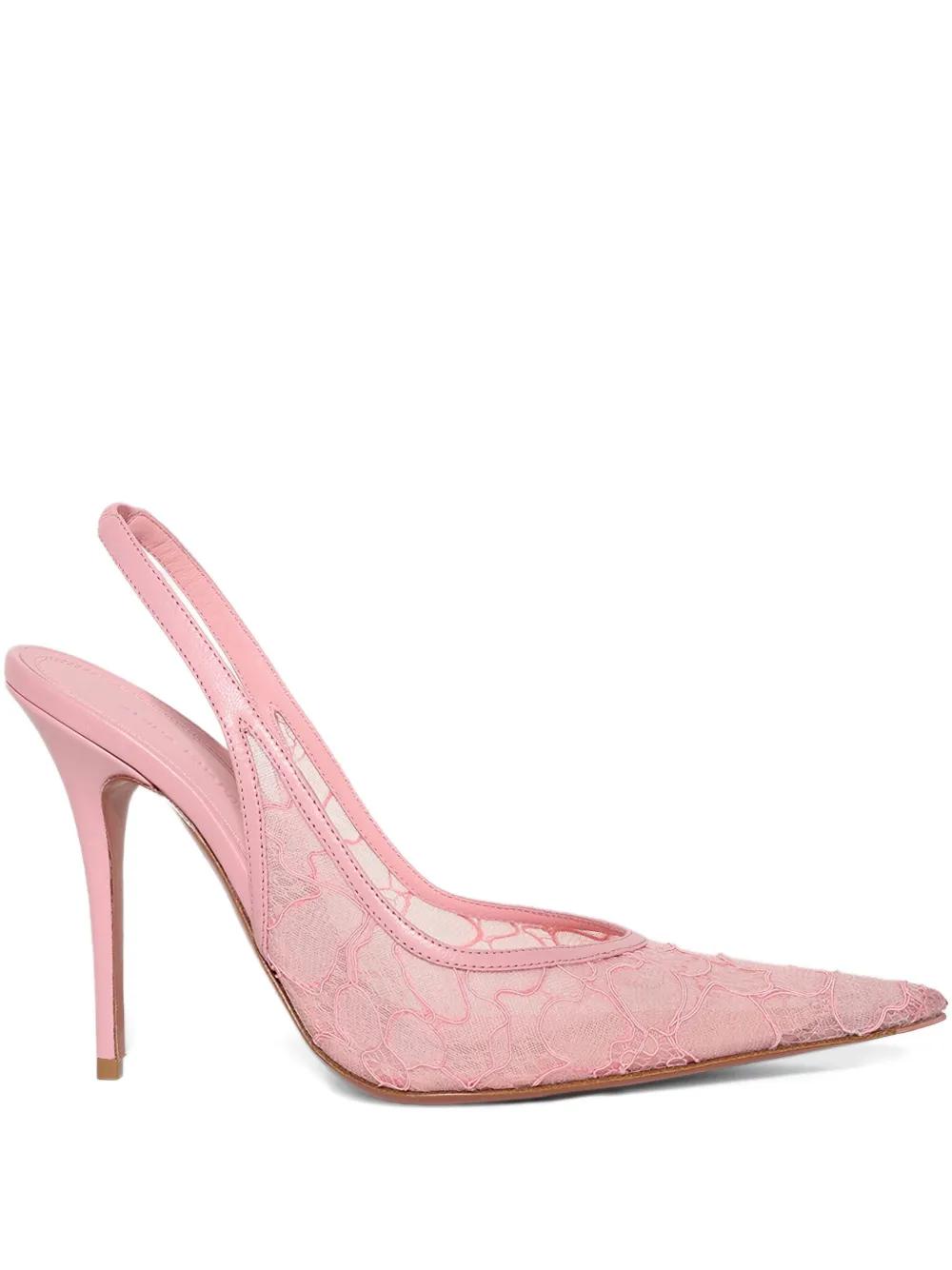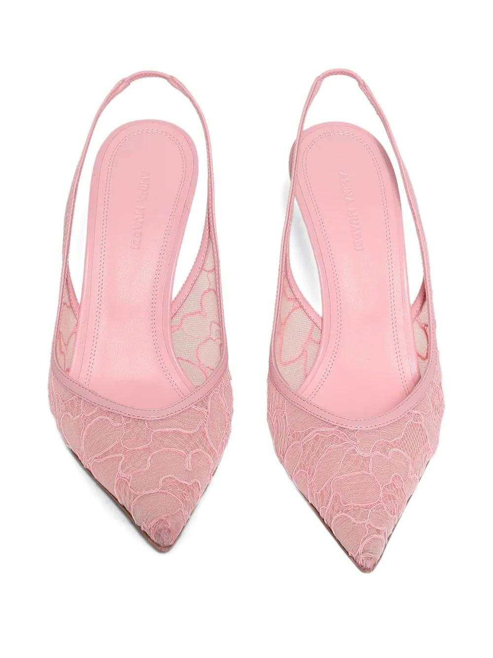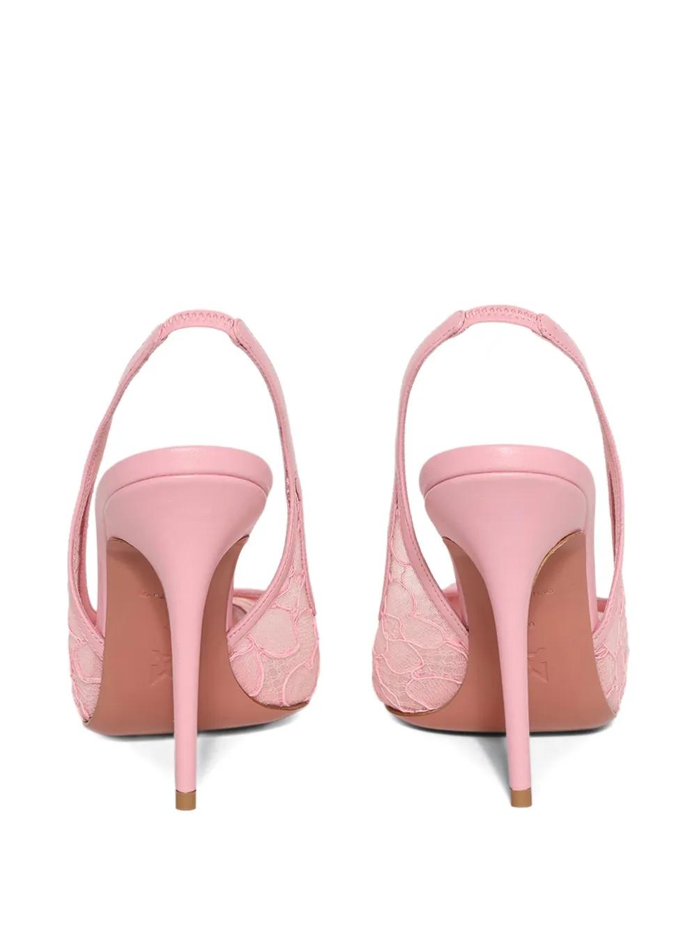 soft pink pointed toe stiletto heel floral lace overlay adjustable slingback strap padded insole