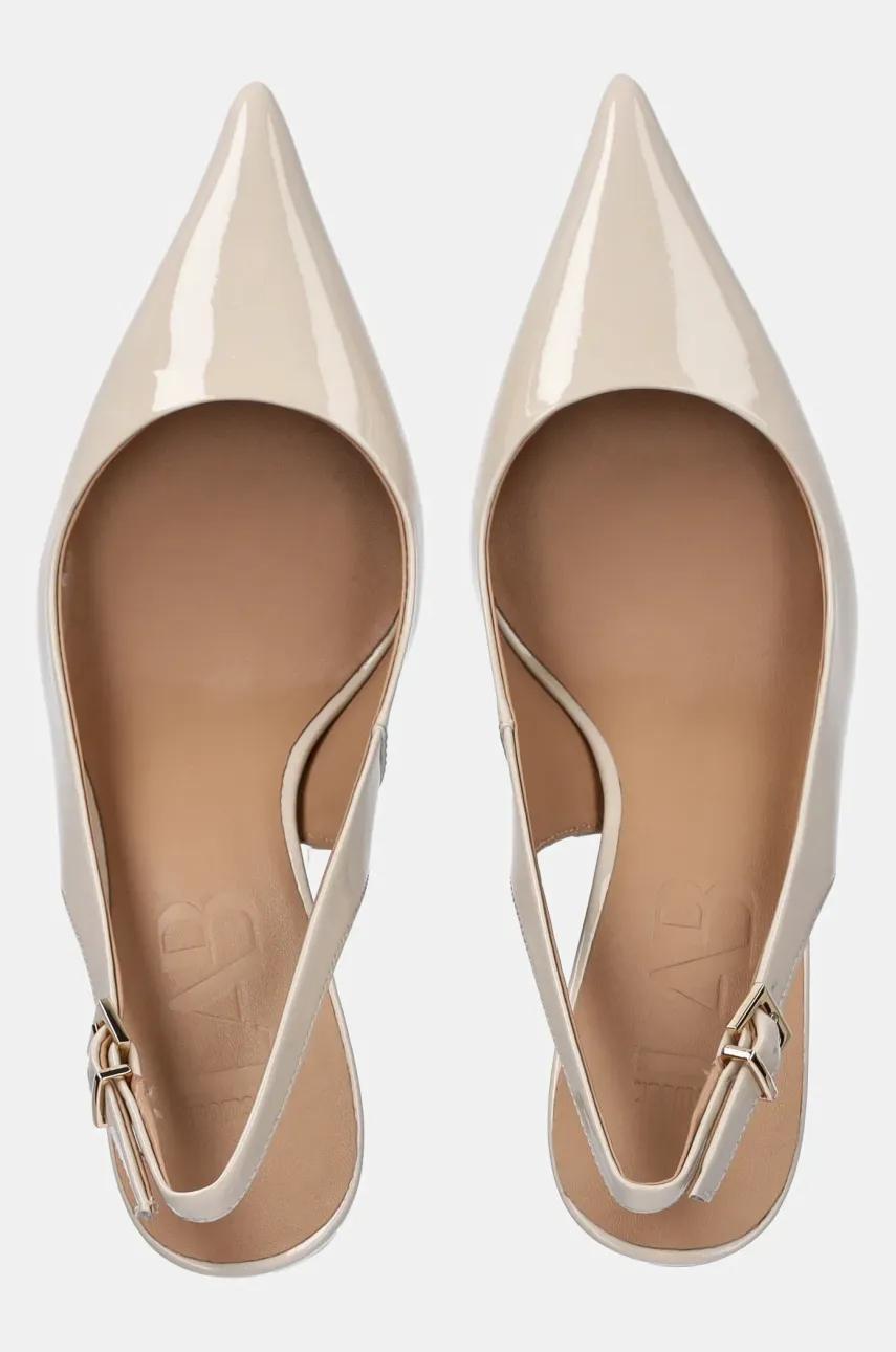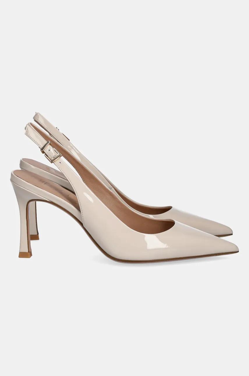 - Spiczasty, usztywniony nosek. - Zapięcie na klamrę ze szpilką, które umożliwia indywidualne dopasowanie. - Model z odkrytą piętą. - Model ze skórzanym wnętrzem, które jest komfortowe dla stopy i zapobiega odparzeniom, otarciom oraz pojawianiu się nieprzyjemnego zapachu. - Model na obcasie typu szpilka. - Wysokość obcasa: 9,5 cm.