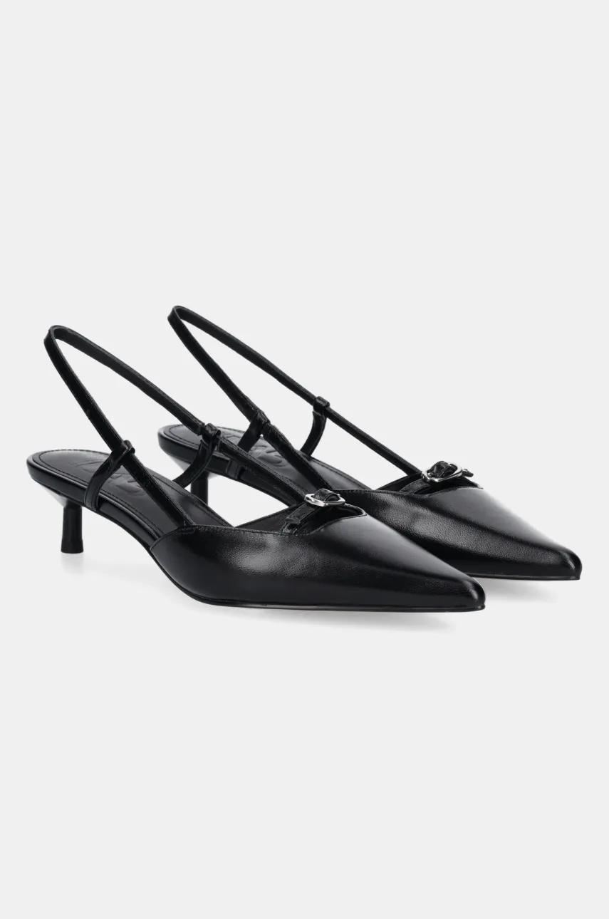 - Spiczasty, usztywniony nosek. - Model z odkrytą piętą. - Gumowa podeszwa zewnętrzna jest wytrzymała i odporna na uszkodzenia. - Do modelu dołączona dodatkowa para fleków. - Skórzana wkładka jest komfortowa dla stopy i zapobiega odparzeniom, otarciom oraz pojawianiu się nieprzyjemnego zapachu. - Wysokość obcasa: 4,5 cm. - Długość wkładki wynosi: 24 cm. - Wymiary podane dla rozmiaru: 36.