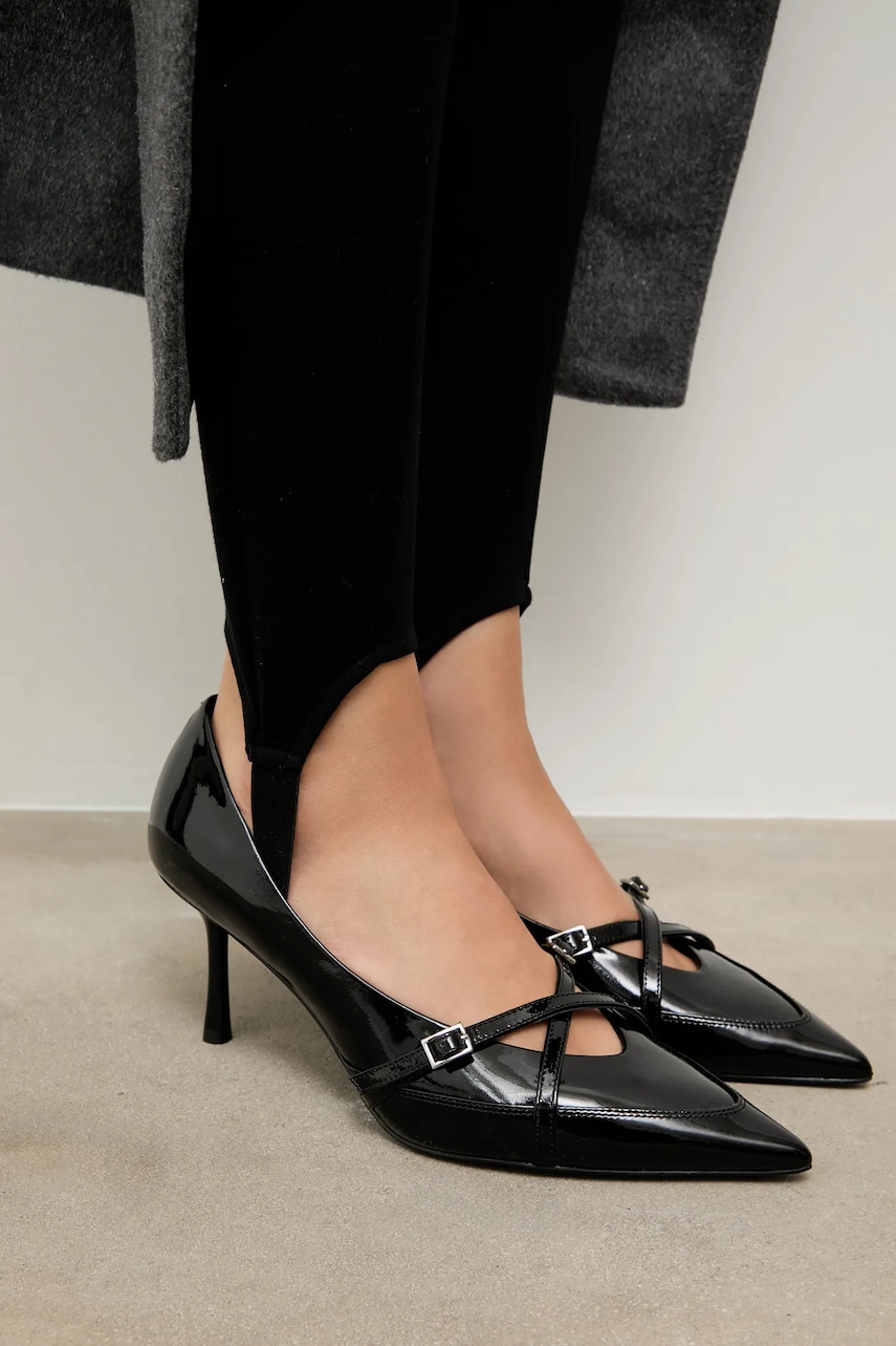 - Spiczasty, usztywniony nosek. - Mocno usztywniony zapiętek stabilizuje piętę i utrzymuje stopę w bucie, tak aby nie wysuwała się podczas ruchu. - Gumowa podeszwa zewnętrzna jest wytrzymała i odporna na uszkodzenia. - Model na obcasie typu szpilka. - Profilowana wkładka wspiera łuk stopy i zapewnia długotrwały komfort noszenia. - Model ze skórzanym wnętrzem, które jest komfortowe dla stopy i zapobiega odparzeniom, otarciom oraz pojawianiu się nieprzyjemnego zapachu. - Zapięcie na dwie klamry ze szpilką, które umożliwia indywidualne dopasowanie. - Wysokość obcasa: 8 cm. - Długość wkładki wynosi: 24 cm. - Wymiary podane dla rozmiaru: 38.