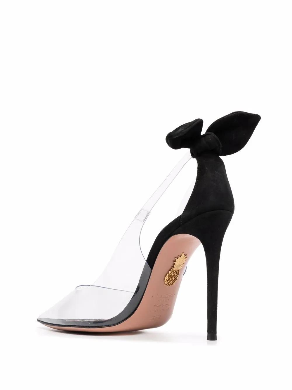 black leather slip-on style transparent design bow detailing pointed toe cut-out detailing branded leather insole high stiletto heel leather sole signature pineapple motif